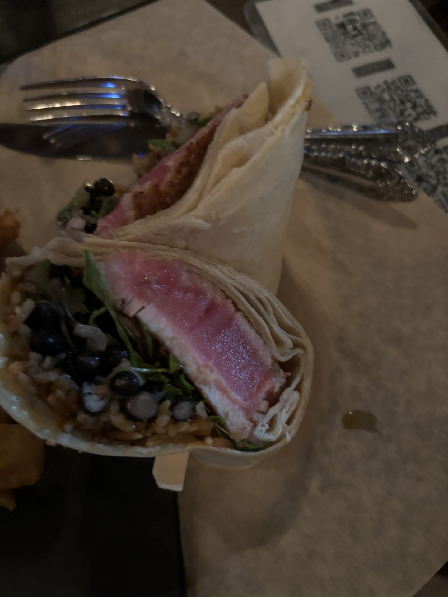 Wrap, It Up Charlie (tuna wrap) - my wife ordered this and I took a few bites without the avocado crema (Iâm allergic). It was good the tuna was cooked well and a nice size. The rice and beans pair with the tuna to give a savory pop of flavor which makes each bite a delight.