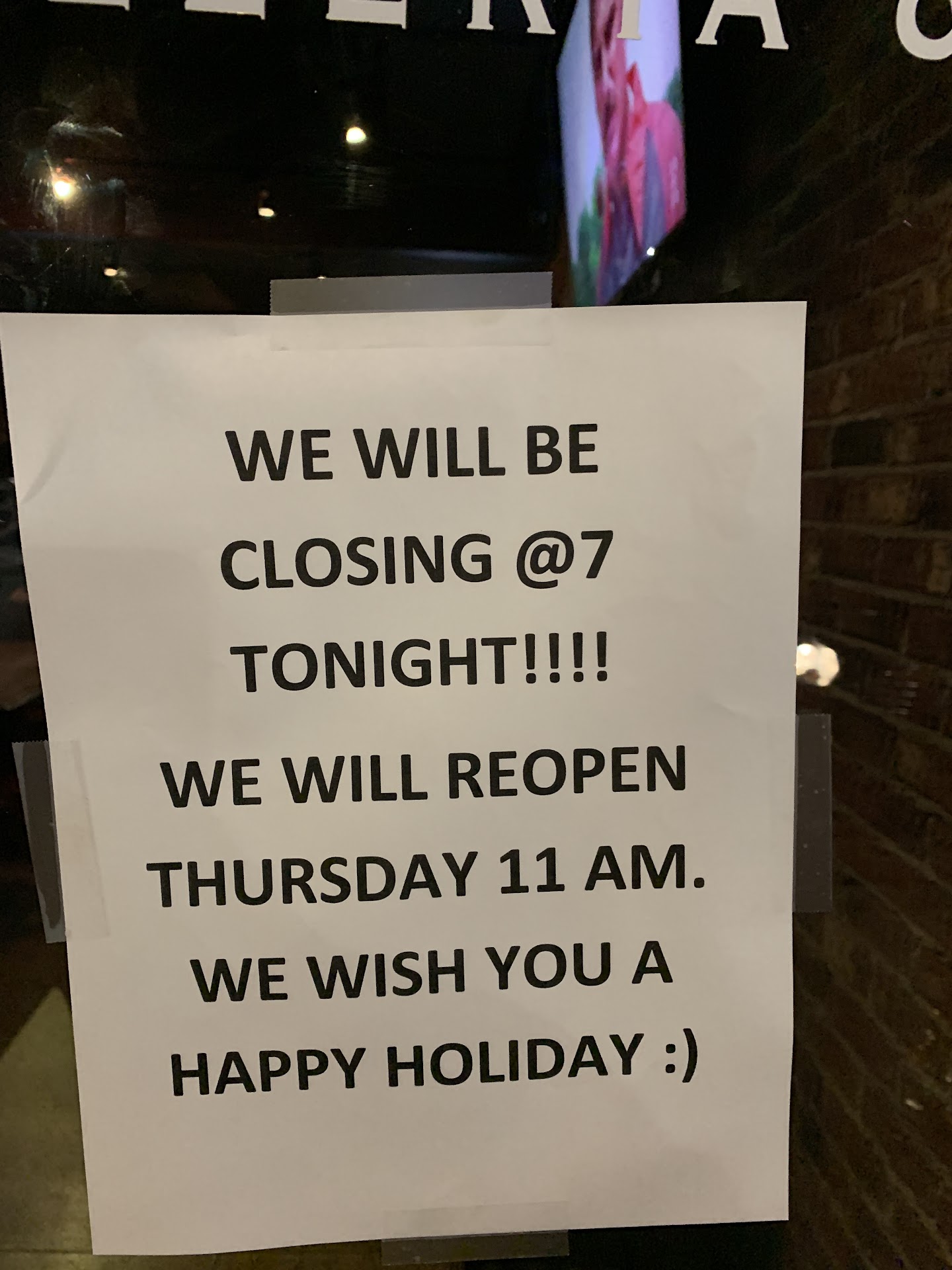 Read moreCame in at 6:20pm looking to get a quick dinner. Inside, the server behind the bar literally yelled across the restaurant to us that they were no longer taking table seats, despite having tables filled already. We asked if we could just grab a pizza to go, and she said no. She claimed that the owner and kitchen manager instructed her to do this. Prior to coming we checked their hours and there was also a sign on the door that said they close early at 7pm.....this is why we came in before then. Y’all should have closed earlier if you didn’t want to serve on Xmas eve, or should have put a “last call” sign on the door as well. As someone who has also worked in restaurants, I understand the annoyance of people coming in last minute before closing. But, “before closing” does not count as 40 minutes prior. We would have had more than enough time to eat and get out of there before the restaurant actually closed. Don’t be rude and yell across the restaurant. Not cool having the entire restaurant silenced and staring over how awkward the...