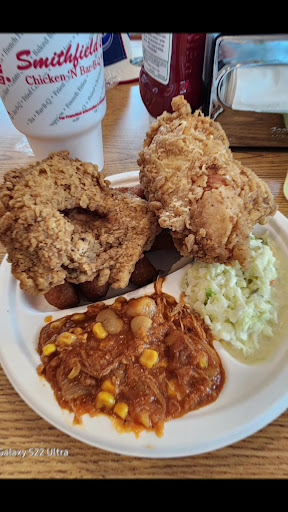 Read moreOrdered at the drive through and asked for three dark meat chicken combo plates. Each plate requested difference sides. We received 3 dark chicken plates, no barbecue. I can forgive that mistake because with each platter wanting different sides and two plates requesting 2 thighs instead of the thigh and a leg, focus was on the chicken and the barbecue was not mentioned, other than saying "combo plates" at the beginning.... and the lady on the register was super nice, in fact I would say the best I have had at that location. The fries, cole slaw, baked beans, and potato salad were good, but the chicken was disgusting. It had about a thick inch of chunky greasy breading all over it, making it appear like the pieces were large, but no, only the breading was large. I had to rip all of that off and then it just had no taste because all the seasoning was in the breading. The price was reasonable and the service was otherwise excellent. What happened to the fried chicken I used to love where you just dipped it in an egg wash and then in a light dusting of seasoned flour? Anyone on Keto - beware! The food came up quick. But.....I will never order their chicken again and cannot recommend it unless you love bread that is gummy from being soaked in grease. My tummy was upset afterwards, which Never...