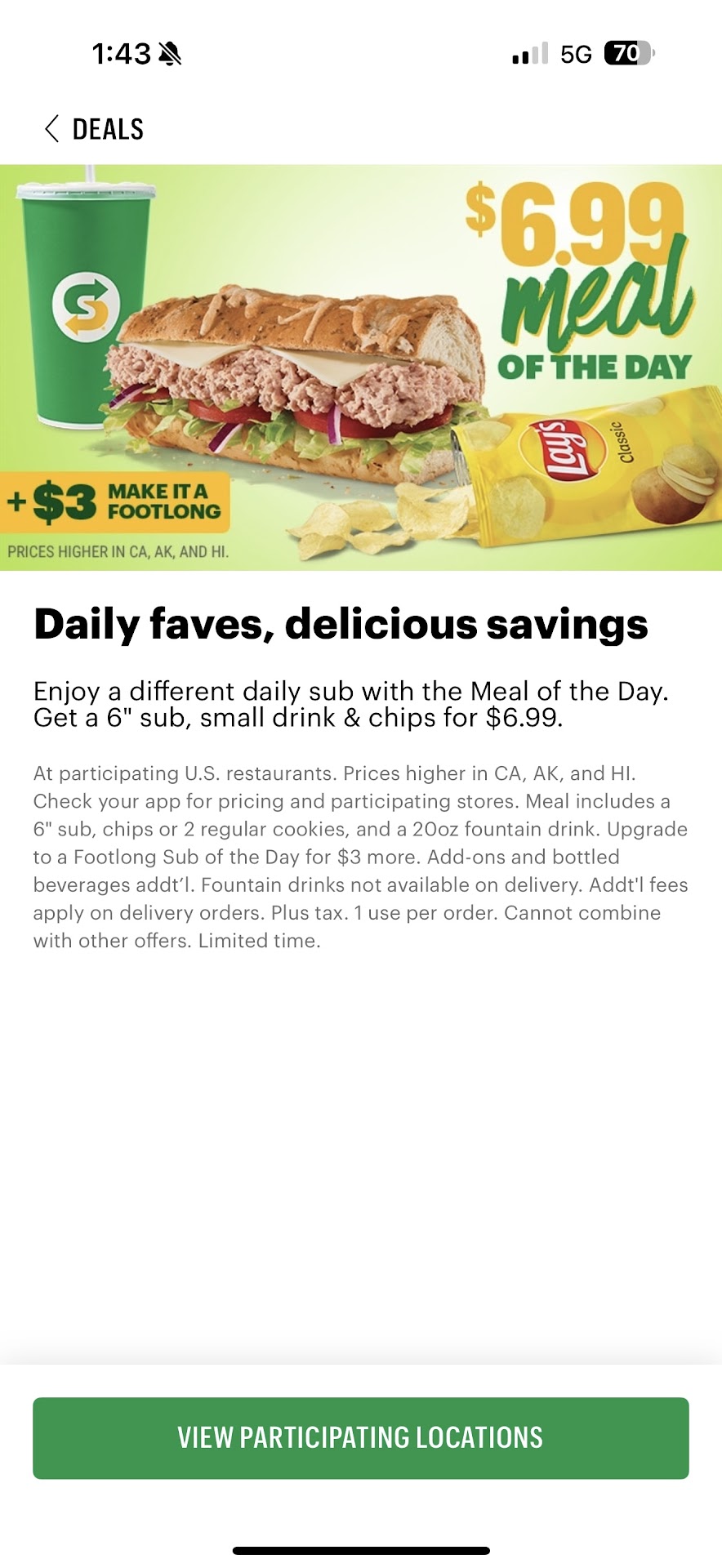7/18/2025 update Still having issues with being charged the wrong amount. Supposed to be $6.99 for the meal of the day. They are charging something for something extra and not following the posted sign rules. Subway is certainly abusing and price gouging our community and neighborhood. I’ll send a message to the landlord to see if we can have a new tenant installed. I’ll see if Jersey Mike’s will be...