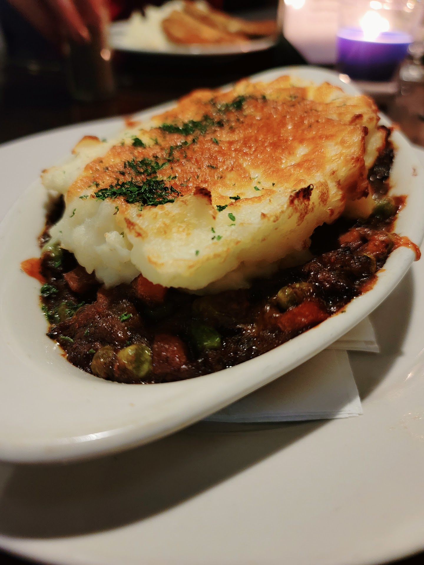 I was disappointed with the Shepherd's pie. The mashed potatoes, thick dollops instead of the potatoes spread out in an even layer, were on the dry side, not creamy at all. The ground beef and vegetables were okay, just not a lot of flavor.