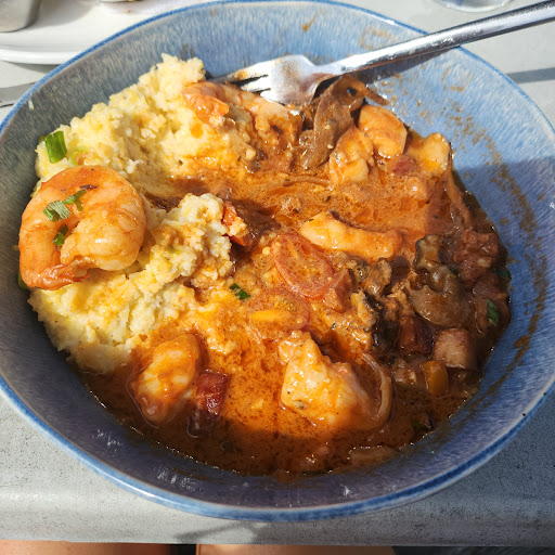 My partner ordered the seafood platter which wasn't anything spectacular to talk about, just a platter of fried items. I ordered the shrimp and grits out of one of the waitresses recommendations, and it was definitely not great, I felt a little sick after eating. The menu really doesnt describe this dish accurately and does not portray an "NC" style shrimp and grits dish. This tasted and looked much more like a jambalaya, creole, Louisiana cuisine of some sort. There were very large pieces of im assuming mushrooms which caught my eye first, which was fine, but I dont like to not understand what I'm eating and again, the dish really was not explained correctly or thoroughly on the menu at all. Again, we don't have to try to make things fancy to make them good. The grits were pretty cheesy, did not get the "green chile" at all. The shrimp seemed a little under done to me. Lastly, but not least important, it was a big greasy mess and could have been why I felt sick. I ate was I could because I was hungry and didn't want to feel like I was being a downer to my partner, but you can especially see in the takeout box all of the grease that had separated. It was just not very good.
