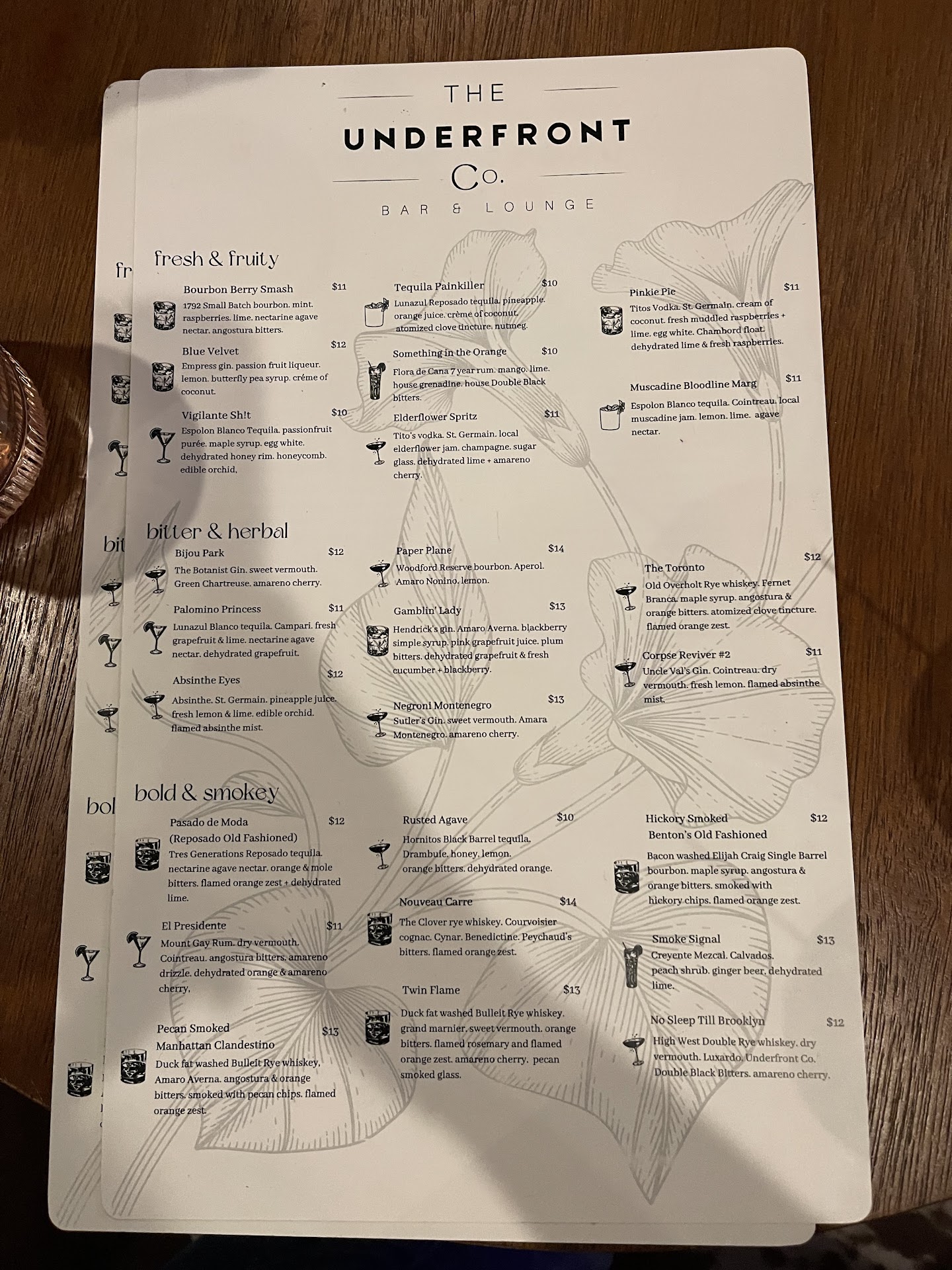 Read moreI just feel lucky that I came in here. The Underfront Co is one of my favorite craft cocktail bars I have been to anywhere. Kinda dark but has a great friendly vibe. Who has three different fat washed bourbons on the drink menu? Underfront does. They have an extensive list of house creations and the drinks we had were fantastic. I donât remember our bartenderâs name but he was happy to talk shop and was filled with knowledge. When he found out we didnât know where we were going to eat he gave us a great recommendation for what turned out to be a fantastic restaurant. Canât wait to get back to Wilmington and will always drop in...