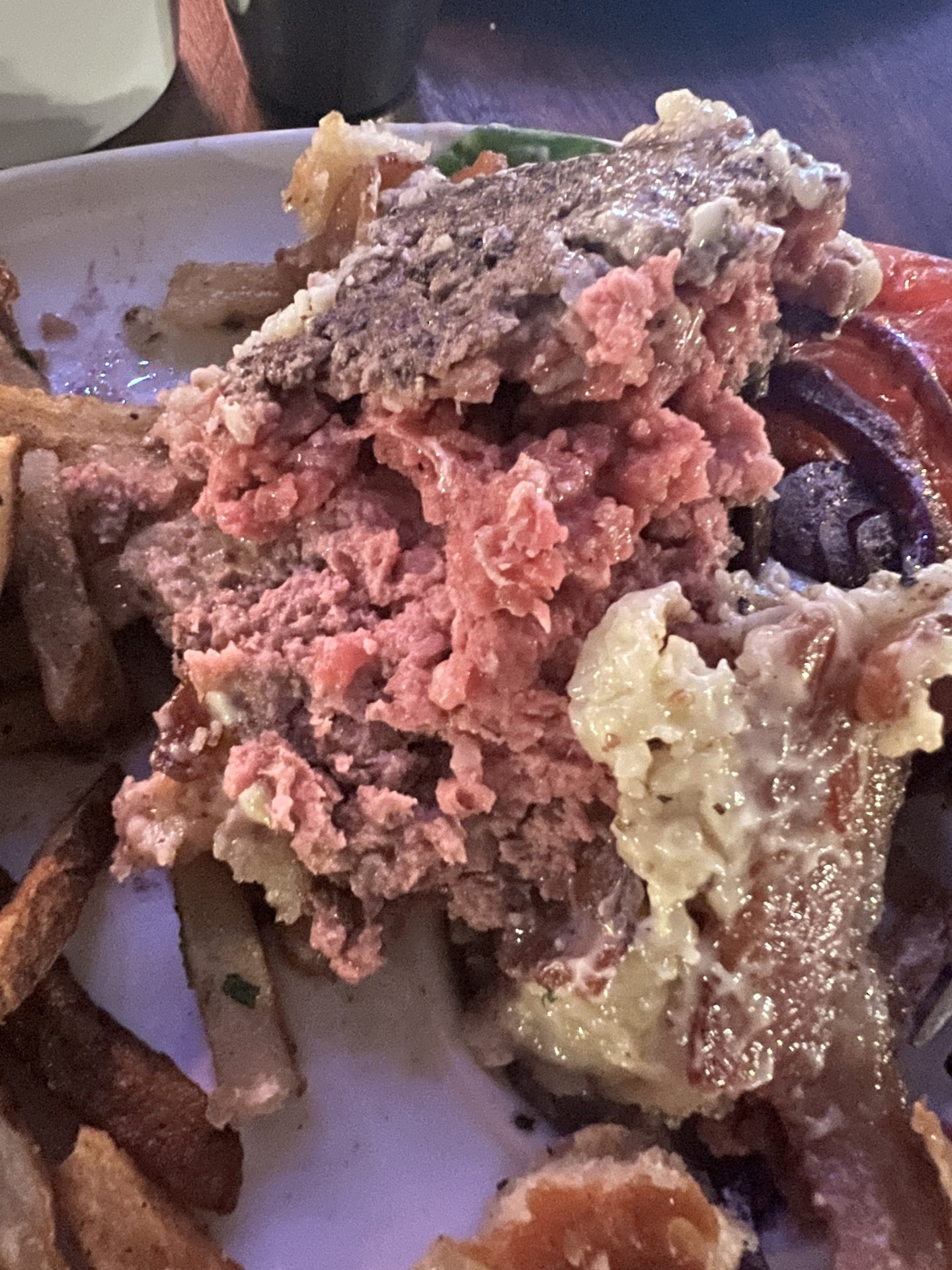 As for the entrees, The bacon cheeseburger (10oz) was fire. Big, flavorful, juicy, and the seasoned fries hit just right—flavorful without being salty. The bourbon-braised mushroom burger? Visually appealing and unfortunately, it didn’t deliver in the flavor department either. Missed opportunity there, it just fell flat.