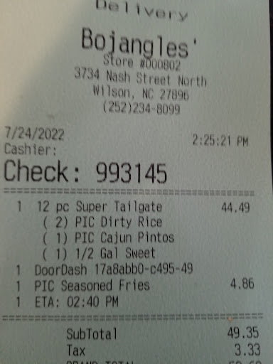 Read moreIf there was a way I could give this location 0 stars I would!!! Worst service EVERRRRR!!!! Went through the drive thru and I drive around just to see that my order is COMPLETELY wrong...AGAIN! I go inside and the employees (1 female and 1 male) are arguing over who is more of a girl. The guy laughs at the fact that he confused my order. The manager walks up and asks whats wrong so I explain it to him. He tells me he will fix it. Next thing you know he comes back and says there's a 10 min wait on my order. I'm waiting and waiting and waiting and meanwhile there's another young lady who was there before me complaining that she had been waiting almost 30 min and that her lunch break was almost over (she worked at taco bell RIGHT BESIDE THIS LOCATION) and STILL hadnt gotten her wings....WINGS! They gave me wings when I CLEARLY said a 3 pc dark with fries and an iced tea. The receipt even stated so. Well as I'm still WAITING I grow more and more impatient especially watching how unprofessional this manager's employees were AS WELL AS HIM!! He's got angry customers and him and his employees are laughing and horsing around. I demanded my money back and had to go through a damn questionnaire of why I want a refund. He said whats the problem? I said YOUR EMPLOYEES!! I also told him I dont trust any of them fixing my food after all I had seen and told him I wanted my money back. He gave it back and apologized AGAIN. Well an apology only goes so far when you're laughing and joking and in no rush while you have angry customers. This is the worst Bojangles location in Wilson NC. If anyone visits this location on west nash street, make sure you check your food or better yet dont even go. Worst...