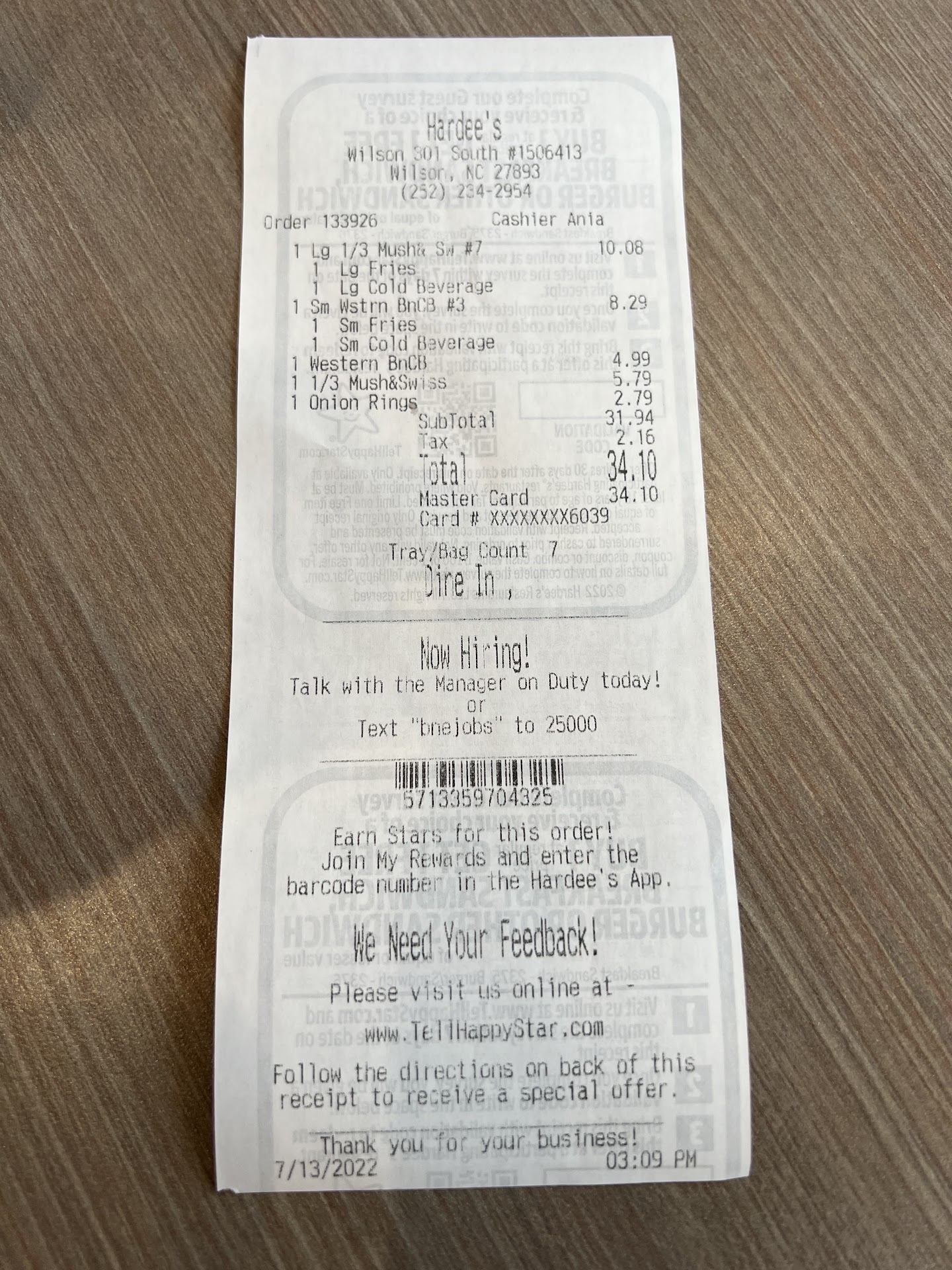 I live in Sims, the Bailey Hardies is closer than this location. I quit going there because LITERALLY EVERY TIME MY ORDER IS WRONG. I thought to myself oh this location is only 15 minuets away and newer. Wouldn’t you know same thing here. I ordered the triple combo as well as a #1 combo. What I got was a #1 and some chicken strips. Being as I just drove 1.3 hours from my job. Stopped for this wrong order I didn’t bother to check it. I like to think people can read. Should have known. Thank you Hardies for Messing up yet another order. And making money off my misfortunes. I do t care to call, complain and go back for the fix. I’m sure somewhere in the world there may be a location that has competent employees but it surely is not in this neck of the woods. I removed being a teenager and going for the thick burgers, curly fries and milkshakes. Back then my order was rite every time and oh so fresh! Guess that’s just a memory and I can promise that you will never get another cent of mine! I know my bad review is just a drop in a bucket. You don’t...