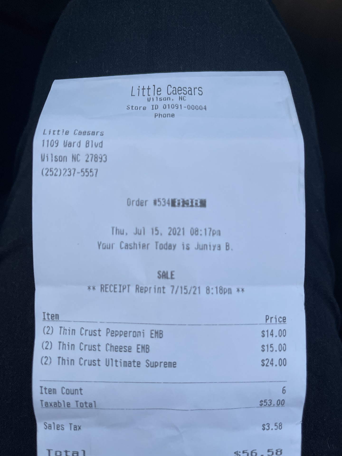 My mom called in an order confirmed with the lady on the phone the correct little Caesars (Ward Blvd Wilson.) We arrive and go in, wait behind a lady ordering and then go up to the register, the cashier didn’t speak to us, and helped the drive through. When done with the drive through the cashier proceeded to talk to the lady that came in behind us and asked if she had a pick up order and I spoke up and said we did( because we did) then the cashier told me our order was not in and told us we were at the wrong location and I said no we confirmed on the phone. He asked another employee to come to the front and she slipped her shoes on came up and just stood there. He rang up another customer and then asked her if she put in our order and she said yes. He told her it was not in there then she showed him how she did it and then he said it’s not made would we like to place it now. No apologies NOTHING! My mother said no she wants what she ordered now and I said he said it’s not made and she asked if I place it now do we get a deal and he said not I started to get loud about us placing an order in advance and he quickly said I will give you bread sticks that’s all I can do…. Still with no apology….. this is not acceptable but because we have 5 kids at home wanting pizza we are hoping it at least tastes good, we will...