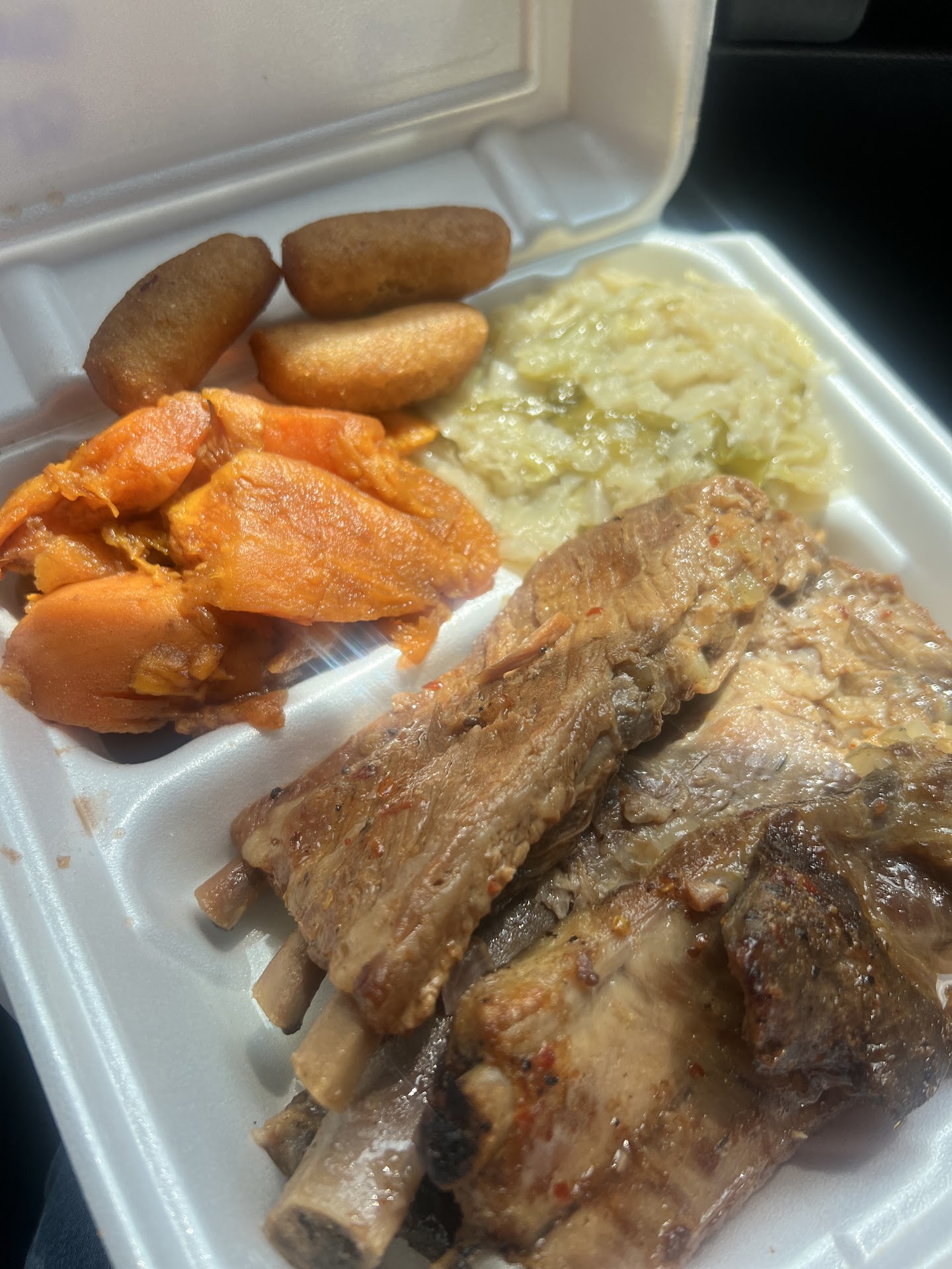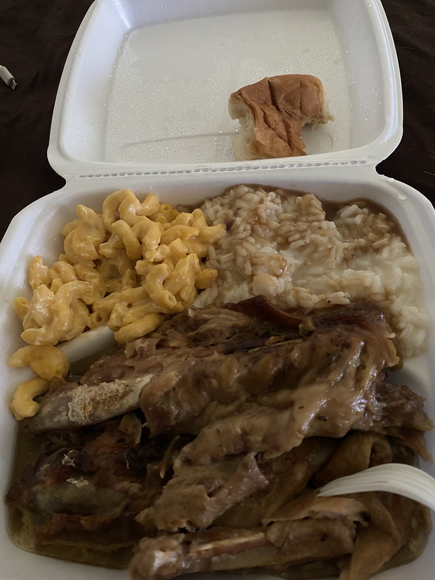 The food is expensive and you have to pay extra for a drink I got to plates which was supposed to be 9.99 with one meat and 2 sides and one meat with one side for 6.99 but I was over charged and they forgot to put my cabbage on my plate and my banana pudding on the side… this was my first time coming here and the total was a whopping 36.62 when it should have been 21.00 plus tax but I said never again I will not step foot back into that restaurant again… the rice is soupy I thought rice is supposed to be dry any…the best thing was the turkey wing ever thing...
