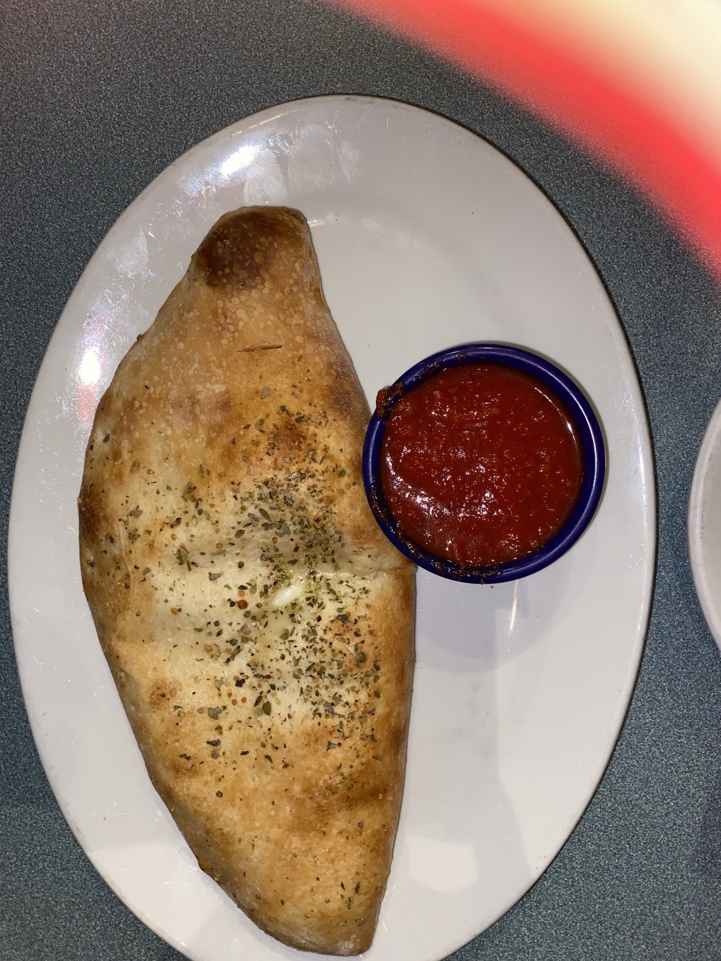 Moving on to my wife's dish, the spinach calzone. Again, no great seasoning, and her initial reaction when she started to look inside was that the spinach was probably frozen (which, in retrospect, is my impression of the mushrooms already mentioned).