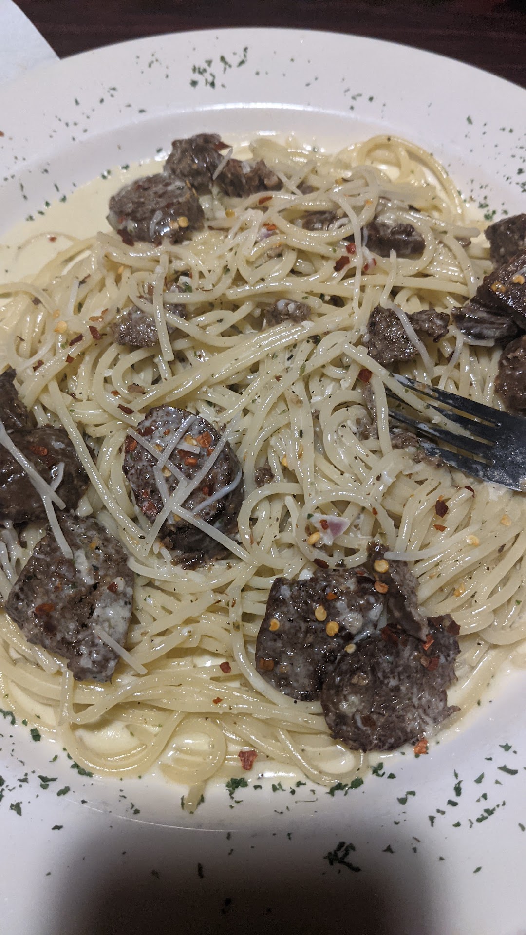 I ordered the Spaghetti Toseanello, which is described on the menu as "Italian sausage and hot peppers served in a rich, creamy sauce." Incredibly misleading, since "hot peppers" basically meant the same pepper flakes that I could have sprinkled at the table (see picture). The sausage was...interesting. I wouldn't have classified it as "Italian," exactly. Texturally, it bore a closer resemblance to breakfast sausage. And the cream sauce had nothing to commend it. My wife commented that it basically looked like and tasted like warmed-up heavy cream. Like the mushrooms, it suffered from a general lack of seasoning. I had to apply liberal amounts of salt and pepper to get the taste to something I was interested in eating. And to think that they charge $3+ for this above spaghetti with meat sauce, which according to the menu comes with choice of meat balls or sausage. When I pointed out the discrepancy between the description and the dish in front of me, I was offered a side of jalapeños, but let's face it, a side of jalapeños isn't going to taste the same as peppers cooked in the dish. Not to mention that I would have expected an Italian restaurant priding itself on authenticity to prefer peperoncino or another Italian pepper to jalapeño.