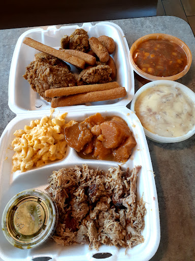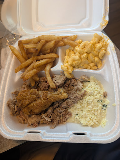 Read moreI've been going by here for years but have never been able to stop. Every time I've gone by the drive thru line is around the building, out the parking lot and on the side street, just like today. It doesn't matter what time of day, weekends or week days it's always the same. I finally didn't have to get back so I decided to see what the hype was all about. I got the small combo platter (BBQ and a leg with slaw, mac and cheese and fries. Wanted to try the cabbage but got out voted. The BBQ was very good. I didn't even put any sauce on it. The leg was great! The crust was flavorful, the chicken was juicy but not greasy and so tender. The mac and cheese was tasty as were the fries, hush puppies and the slaw. The people were so friendly and did a great job even though the place was packed. No empty seats but the 1 we were lucky enough to snag. You could tell they were used to it. We decided to go in rather than through the drive through because I didn't want to eat on the road while driving home but the drive thru seemed just as efficient. This was 2:30 on a Sunday and you would think it wouldn't be crowded but just like every other time I've been by they were slammed. They have meat and desert specials during the week listed on the TVs. I will be back to try those. The amount of food I got for $8.40 was crazy, considering other places I've been lately. If you're like me and don't stop because you don't want to wait in line you're missing some good...