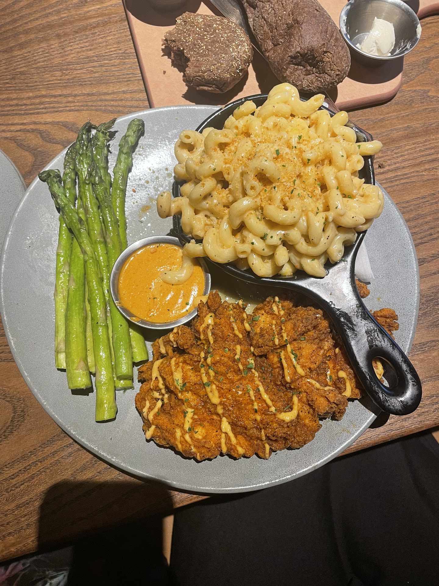 Food came out and it was SOO GOOOOOD😛😛😛 I got the bloomin fried chicken with some asparagus and Mac and cheese. It was all so perfect.
