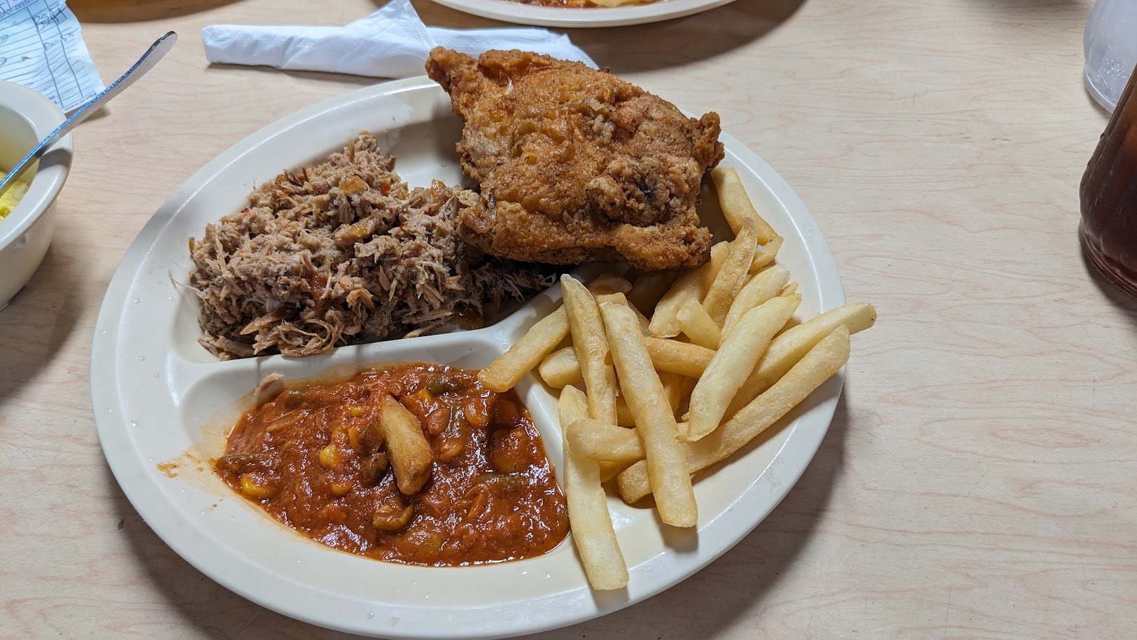 The menu that day was very limited. I believe the options were only pulled pork, fried chicken, and then all the sides. The only other option we had was if we wanted one plate, or an unlimited amount of everything. I have regrets only getting the one plate, but what can you do.