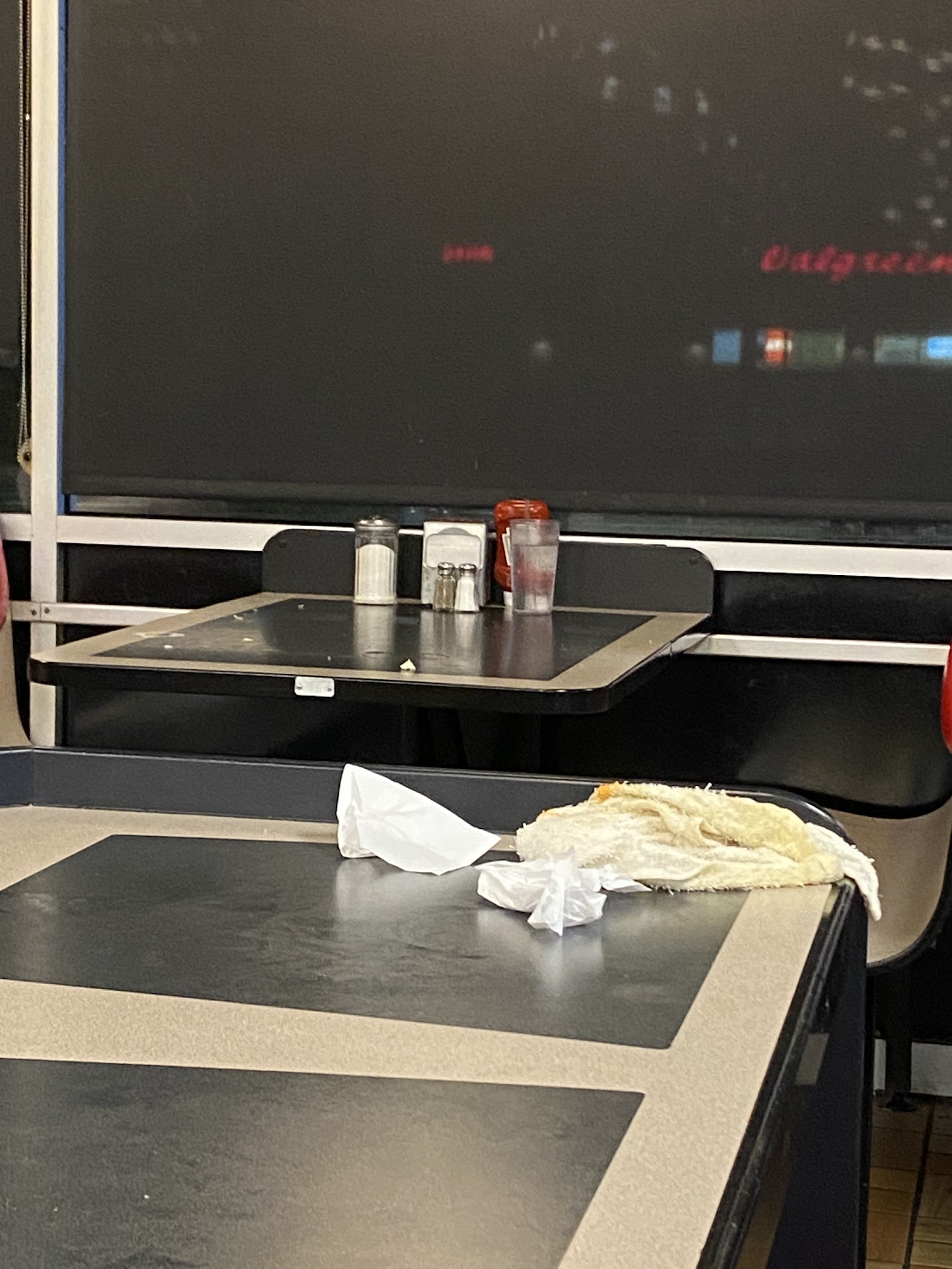 Not worth it. GO TO DENNYS 6 MINUTES DOWN THE ROAD!!!!! From when I pulled into the parking lot the girl inside was staring at me and she stared at me up until I sat down. The only clean place to sit was at the stand so I sat down and there was already a menu there so she didnāt speak to me., She then came up maybe 5 minutes later with a paper in her hand and just stared at me so I placed my order and waited for 25 minutes before leaving. No silverware, no drinks were served after I gave her my order. There was another boy working with her and he stepped out to smoke, the entire time he was outside she kept saying āI donāt know where heās at but he needs to come clean off these tables and cook these people foodā she then started cleaning food off the counter with the fork in the picture and still used that fork to pick up peoples waffles and serve them. He came in maybe 10 minutes later and put my order on a plate. I had ordered the Chicken sandwich with hash browns the only thing on the plate were my hash browns (which were burnt) and then my chicken. I left when I saw that it was the only 2 on the plate and he hadnāt even started cooking my bacon yet. By the time I got my food my food had been sitting out so long that my burnt food was cold. I got up and left and went straight to Dennys 6 minutes down the road 10/10...