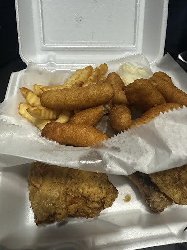 Read moreThis is some really good Eastern NC BBQ. The sandwich had a very generous serving of pork BBQ with traditional Eastern NC BBQ sauce and coleslaw, the hush puppies were made fresh, while the sandwiches were being prepped, the fries were hot and crispy. They had homemade slices of cake, if you mistakenly thought you'd have a crevice of room left to wedge something else in after all that other food ( though I think my 19 year old nephew ate his whole sandwich, two pieces of fried chicken, french fries, and some hush puppies, too...)(those young guys .. amazing metabolisms...). They have bulk meal specials, fried fish, a great choice of sides (when you get meal specials), and they serve breakfast on weekdays - I'll have to go back to try that. Dad and I enjoyed talking with the people behind the counter - I've been before and will go back. Next time, I'm getting the 7-layer slice of cake and saving it...