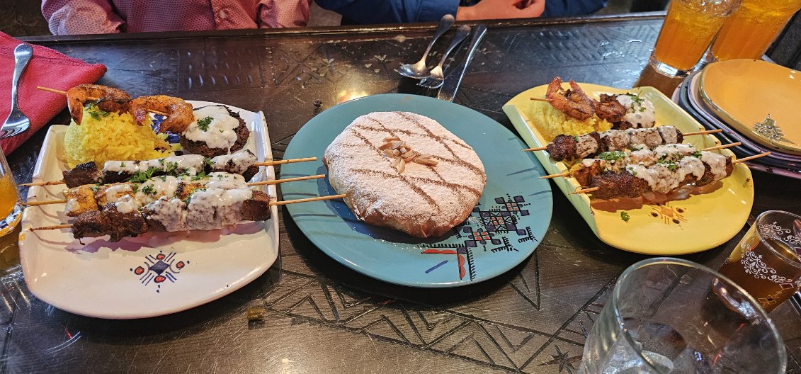 Everything I've had on the menu is very good. My favorites (dinner) are the lamb tagine (although if you love olive and lemon, the other tagine is excellent as well) and the sampler plate (dinner) and the gyro (lunch.) If you like chicken, the chicken kabobs are excellent (I do not generally order chicken breast at restaurants because it is usually dry; here it is moist (I suspected marinated in yogurt.) The spinach salad is tangy and sweet (black olive tang, savory feta, sweet/tart cranberry/pomegranate, and dry/nutty almond.) The saffron rice is very delicious and so pretty on the plate! The pita and hummus is yummy. It's on the thinner/more tahini end of the hummus spectrum.