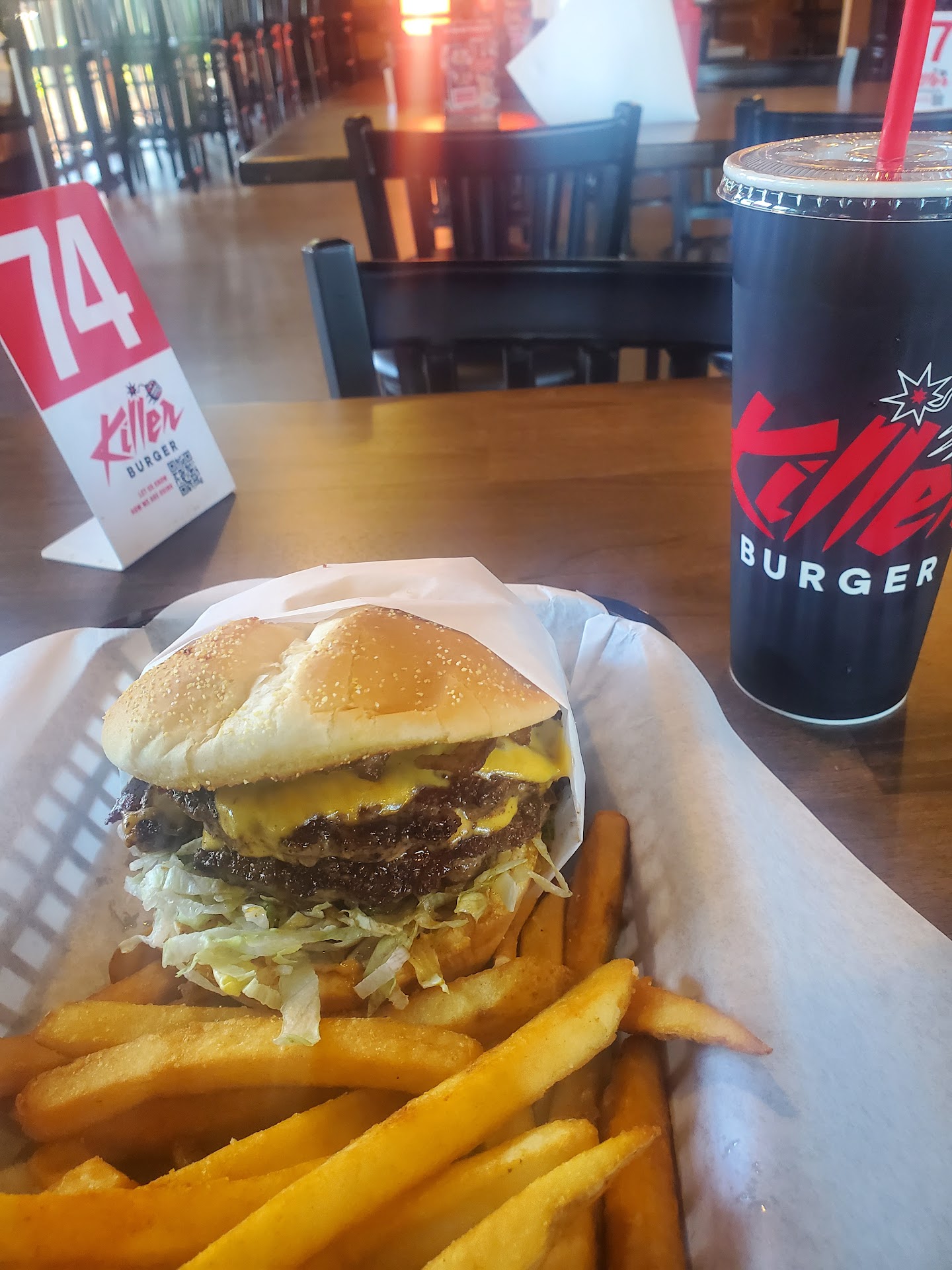 ย ย ย Read moreI wanted to share my experience with the staff at this Killer Burger location. Before I placed my order with the cashier, I noticed that she was wearing black nitrile gloves. Pretty standard for a place that serves food. However, they looked to be covered in grease and remnants of food crumbs. I place my order with her and paid with cash. While still wearing the same gloves she took my cash and handed me my change. Then she handed me my cup for my meal... wearing the same greasy gloves she handed me my cup with her index finger inside the cup. This left a greasy fingerprint on the inside of my cup. I should have asked for a new cup but didn't. I grabbed a napkin and whipped off the grease. I only filled my cup halfway and drank from the other side but was still of put by it all. Unfortunately, it doesn't end there. This same employee with the same gloves on delivered my food. I watched as she delivered others orders as well while still wearing the original greasy gloves. And on top of all of that, this employee wearing the same gloves began to clean the drink station. She then went back taking orders, with the same greasy original gloves, after cleaning the drink station with a spray bottle and rag.