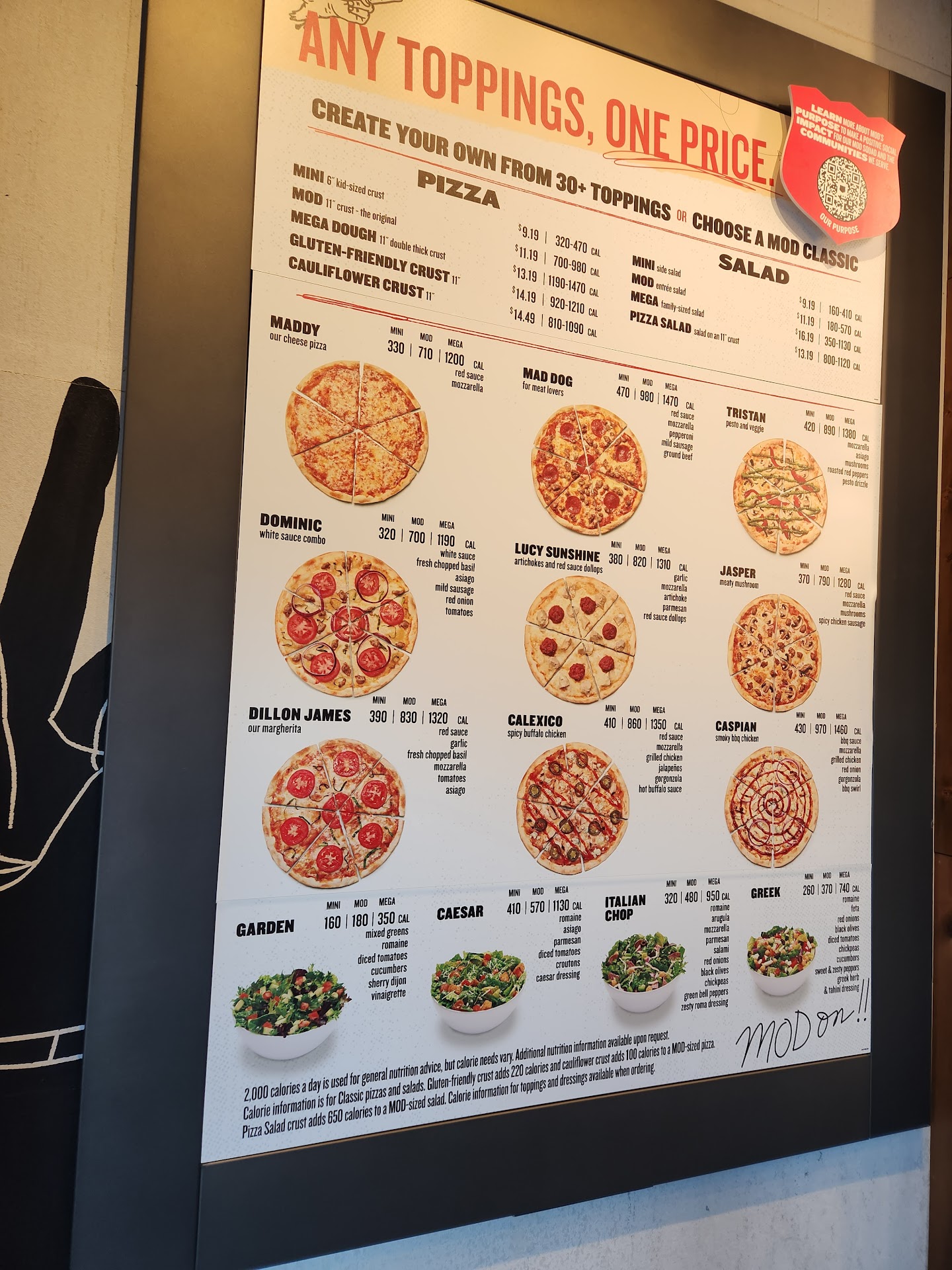 Price: you can get three different sizes. We got the mod size which is about 11 in in diameter. It was more than enough pizza for one person I thought. In fact I walked out with 1/3 of mine left. The cauliflower crust was about $14 and the regular mod size is $11. These are reasonable prices in today's expensive world.