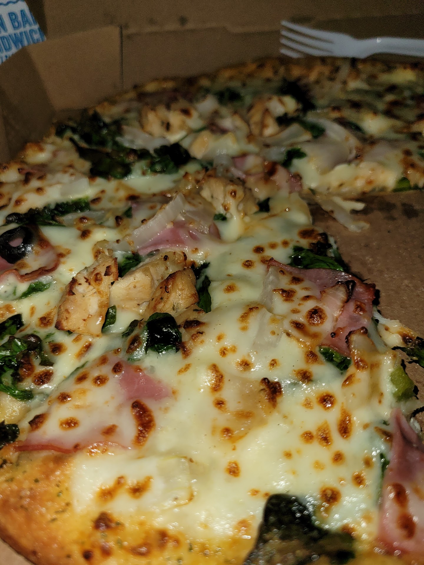 I swear on everything I love, (which happens to be mainly your guys' food) I started crying because everything was so delicious. Granted, I am pregnant, but that isn't the point. I couldnt dexide on what i wanted for dinner, so I got 2 pizzas, stuffed cheesy bread and a sandwich. As soon as I got the order, I devoured half of the philly cheese steak sandwich. 100% excellent. I asked for light American, extra prov. and extra steak, light mushrooms. It was ON POINT! Then, I proceeded to the stuffed spinach & feta cheesey bread. Oh my goodness. I wanted to eat the whole thing! Next, I counted my 8 packets of parmesan cheese and my 5 packets of red pepper flakes that I requested. Both 8 & 5! I opened up the box of heavan, I mean buffalo chicken specialty pizza. Bam, 2 ranch cups that I asked for. I took 1 slice, about half way through... that was when I started crying. It was so amazing. The perfect amount of sauce and cheese and the onions just made it heavenly. I was starting to feel full, but proceeded on with caution to the next pizza. Sadly, I was so stuffed that I couldnt finish it, but it was so gosh darn good! I got the extravaganzza specialty pie, no mushroom, beef or black olives. Instead, I added chicken, pineapple FRESH spinach and philly steak. So there were about 1000 topping on that one pizza. I am waiting until I am done writing this to finish that darn slice that I started! Whilst consuming my deliciousness, I was reading the boxes. I never knew that each one was COMPLETELY different!!! My favorite is the medium pizza box. THE CHEESE IS THE BEST PART!!!! So thank you all for making my night as awesome as you...