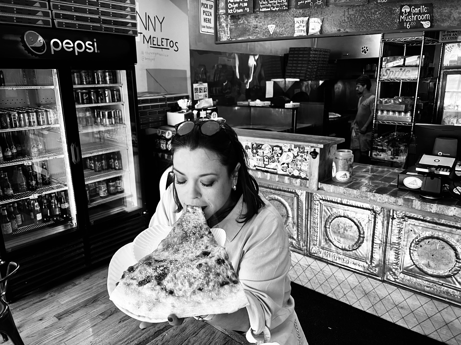The food, like many other reviews, is simple and bland. It use to be good but the crust way too thin and burnt, no sauce, and the cheese is almost nonexistent. The slices nowadays are MUCH SMALLER than they use to be. Seriously, they are the same size as mall food. I thought the whole deal is getting a large slice, a Virginia slice?