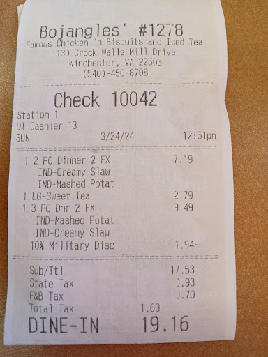 Read moreWe were on the way home, from West Virginia heading back to Maryland, and we stopped at Bojangles to grab a bite to eat! I have never heard of or seen a bojangles. This place is hands down one of the best fast food places I have ever been to! And it is now my number one choice for foodAnd my family eats out a lot, we rarely eat at home, so we have been to just about every food place near us. The service was amazing, the employees were super helpful, professional, happy, and super nice! The inside was clean, and the bathrooms were clean too! The food was absolutely delicious, it's hard to believe the food is considered fast food! I had a chicken breast, Mac and cheese, french fries, with a coke! I will be visiting Bojangles EVERY time we pass one! We don't have any in my area in Anne Arundel County, Maryland! I hope to see one in my...