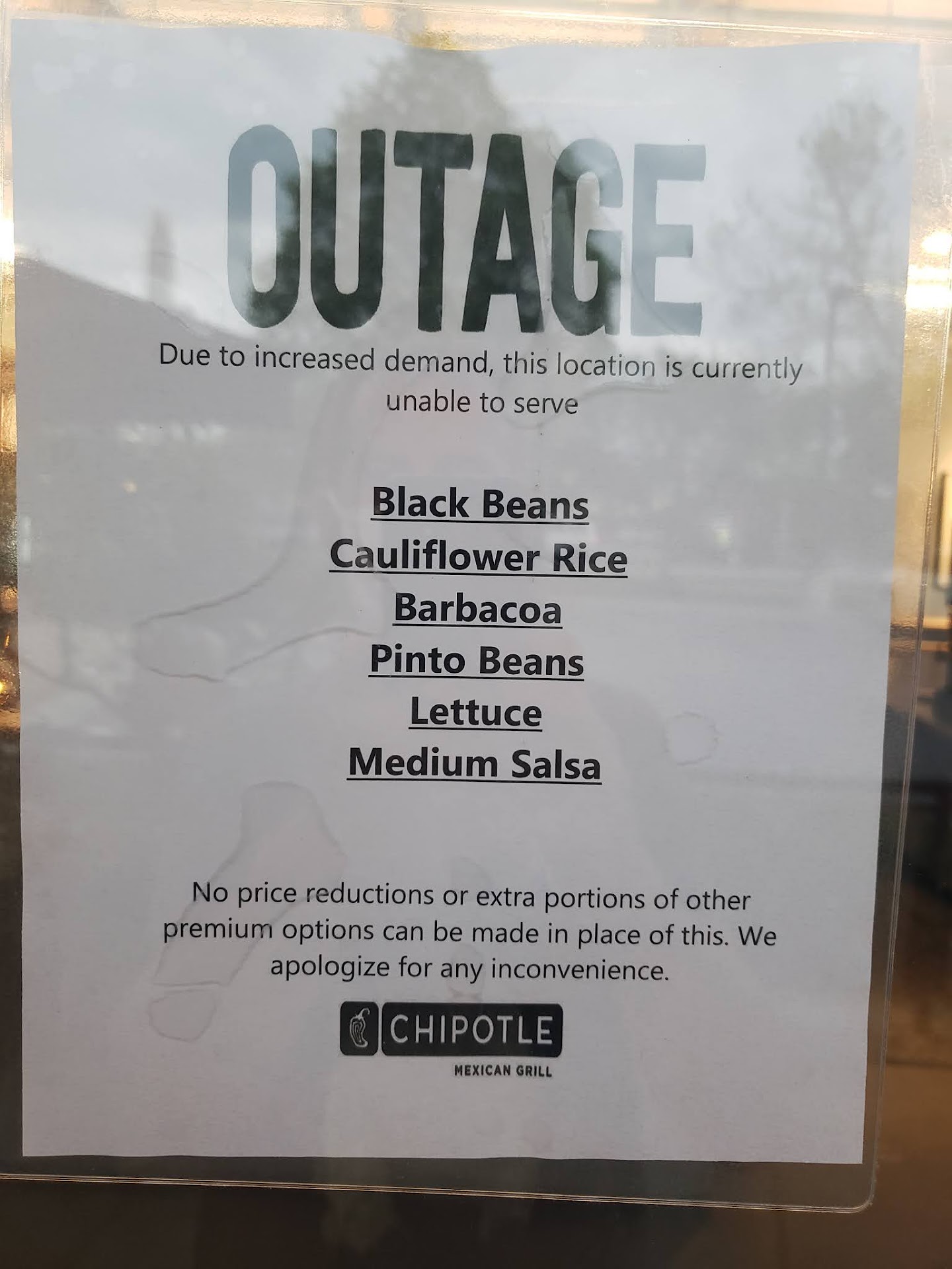 I used to eat here weekly at minimum. Since covid, the portions have come way down and these issues have gone up. I'd forgive them if we were in a food shortage, but they share a parking lot with the biggest grocery store in town and I personally build a two acre lettuce farm the sells to whole food 25 miles away growing 100,000 heads a month. At 17 I managed a subway. You know what I did when we ran out of something. I walked my 17 year old self down the block to the grocery store and I bought a case of it. To tell people who are paying for a meal they don't get it all because you made the effort to stand in line is terrible. I was literally told that's for online orders, no dine in. I decided to take some pictures, and lets say I got some great ones of cross contamination on the take out bar which will show you all the food they have in excess, along with the list they only put up after 6 of us in a row asked them too because we felt we were conned. We ate outside, and I can tell you right now that a large proportion of Winchester is catching on, because multiple people brought up the management and this isn't that rare anymore. We all decided to try MOES next time. And Chipotle, you sent us there.