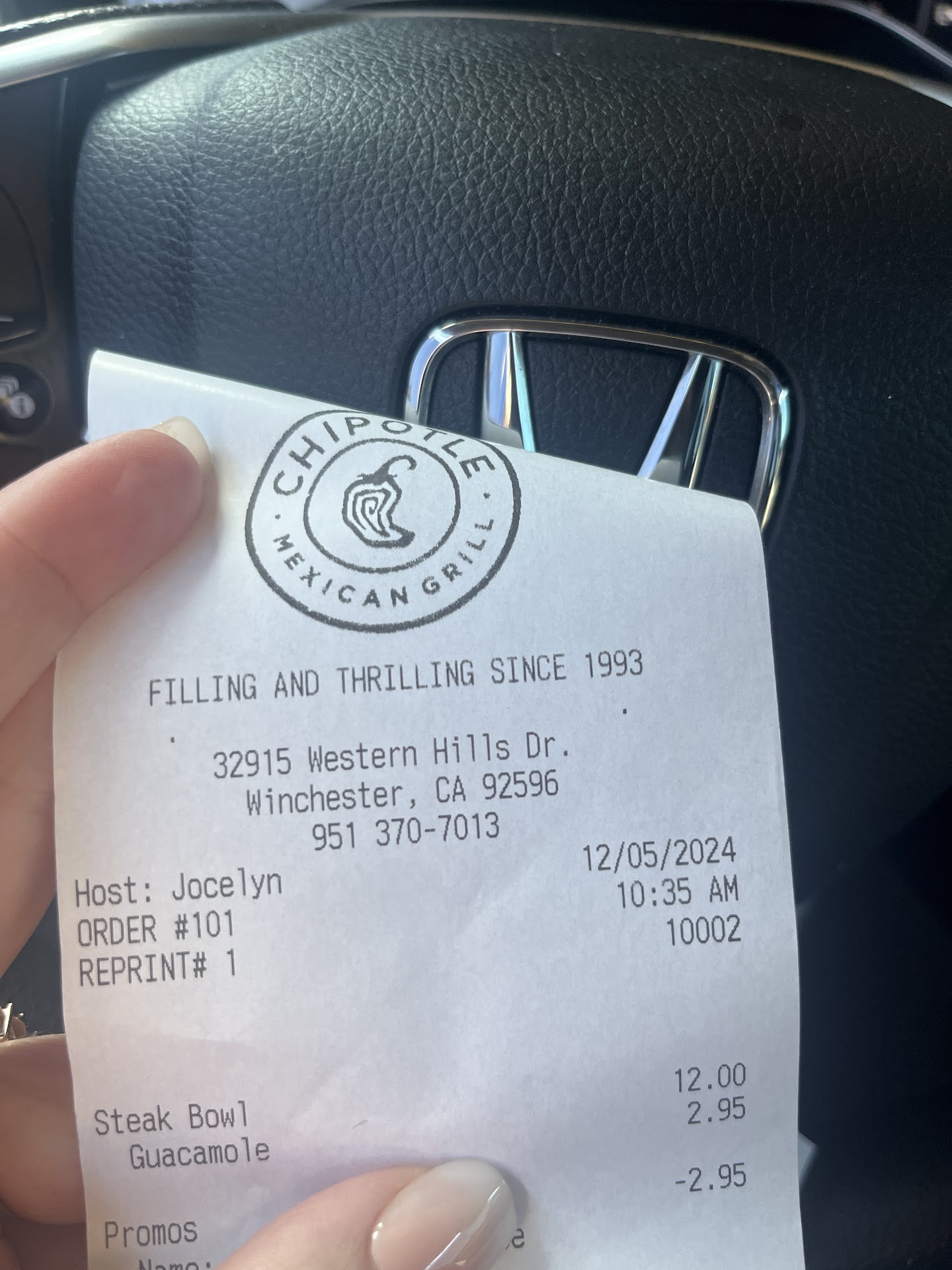 My wife and I went into chipotle each of us getting our own entree. The girl who helped us was named Jocelyn and she was way TOO fast at taking both of our orders, mind you by the time she got to us this other lady BARELY walked in the place. I had asked for double chicken and she gave me one full scoop and the other scoop was barely the tip of the spoon with chicken so I looked at her funny and asked for more chicken and she said she would have to charge me for triple chicken after I didnāt even get my whole second scoop?? I said fine Iāll pay for it and she gave it to me and then was soo fast and getting my toppings and then I asked for a LARGE guacamole and she ran so fast to the little cups and came back with a regular size? Mind you when I asked for guacamole I said it loud so the guy who was behind her literally heard. After she came back and filled the cup and set it down she was going to my wife to take her order, she got white rice, chipotle honey chicken, beans, sour cream, cheese, and red salsa. Tell me why her bowl BARELY has anything in itš she didnāt give my wife a chance to even ask for double because she was way too fast and just wanted to get us out. The guy who was behind her ended up checking us out and while he was getting my total ready he says āare you getting a large size along with your regular sizeā Jocelyn IMMEDIATELY turns around and I say āwhat?ā And he points out that itās in a regular size cup and Jocelyn says āyou said you wanted regular not largeā with a face and tone full of stank attitude, I replied back with āitās fine Iāll just buy thatā she did ask if I wanted a large instead but with the way she responded about the situation made me so uncomfortable I just wanted to leave. Chipotle is one of my favorite places to go eat because of how good everything is but with how this girl acted I unfortunately donāt want to buy from chipotle anymore it just kinda ruined the love I had for it which is...