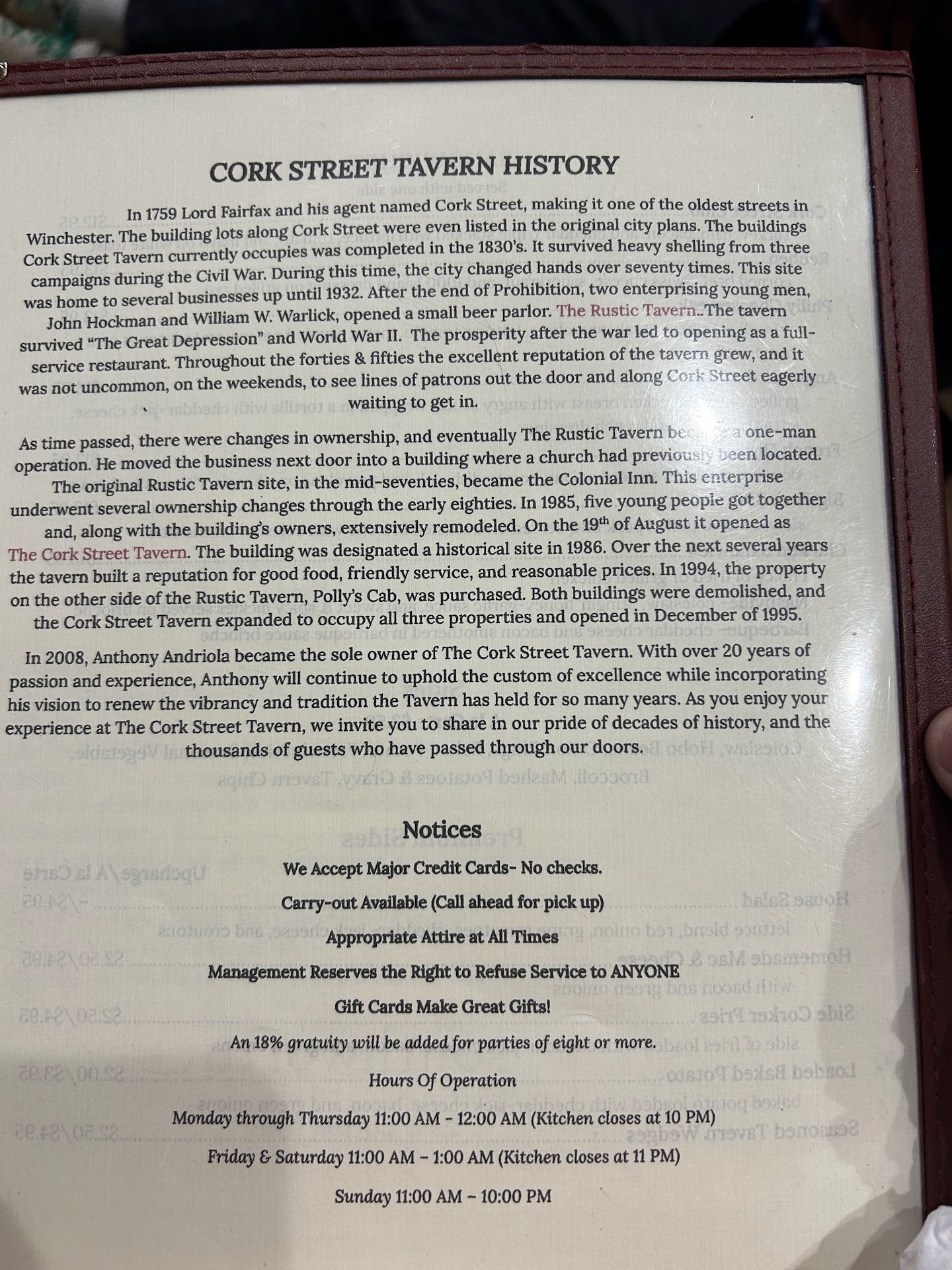 Read moreVery disappointed in service and quality of food. It's a shame too as my wife and I frequented Cork Street Tavern in years past.