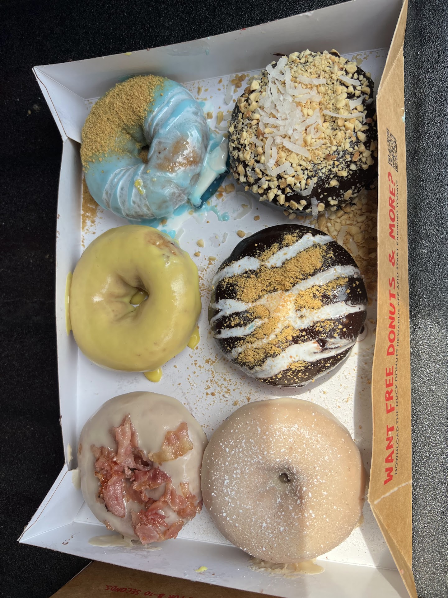 Read moreThis was my first time at any Duck Donuts and it was really pretty tasty! I had the Peanut Butter Paradise and the Midnight Madness and a hot mocha. The donuts were warm, fresh and flavorful and had a bit of crisp. My mocha tasted like a latte with a lot of milk, so I'd probably recommend you go elsewhere for coffee. It's a really chill vibe inside the store and the people working here are super friendly and kind. Unfortunately, my order took over 30 minutes in total to prepare after I waited for a while and then asking for status at the pickup counter. I saw a number of customers waiting at least 20-30 minutes, but they had larger orders. The donuts were hastily prepared and the box had chocolate all over the outside so I carried it with a lot of napkins, haha. I'll give it one more try (maybe when online ordering is a thing) and update this review if the next visit is a...