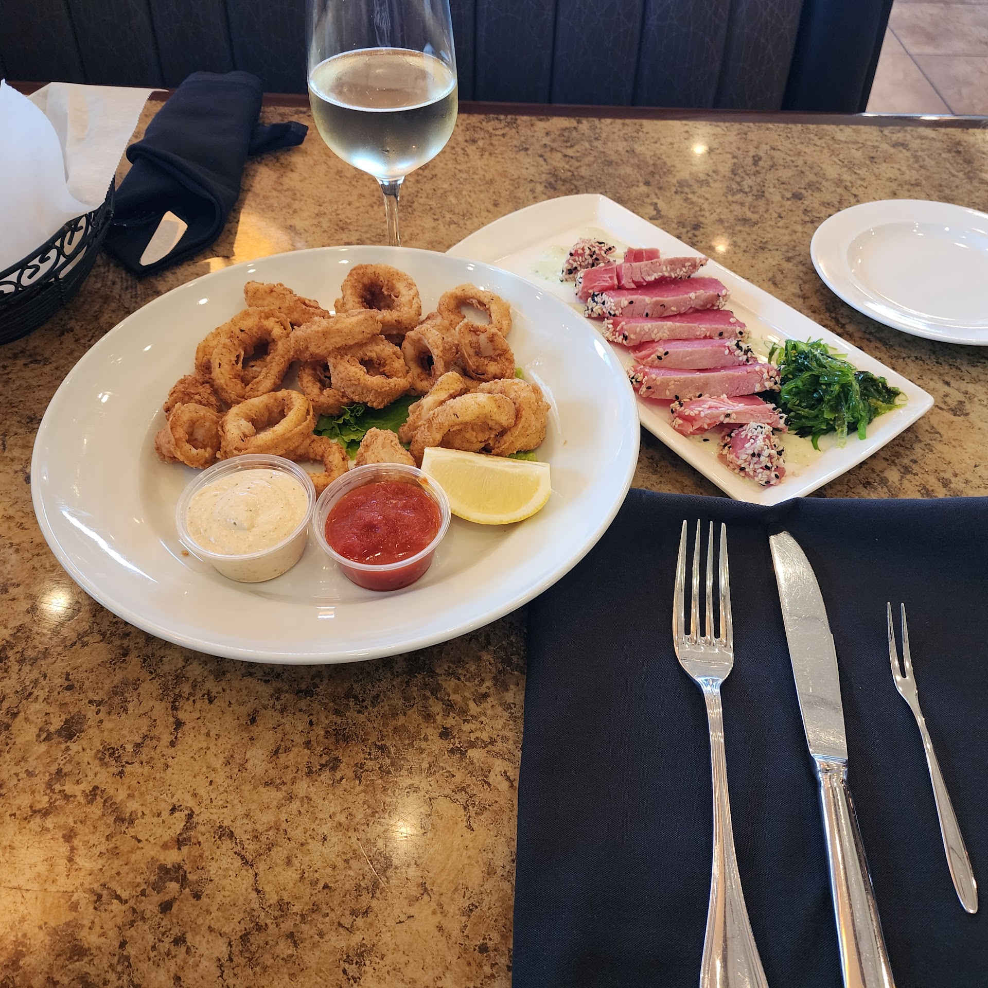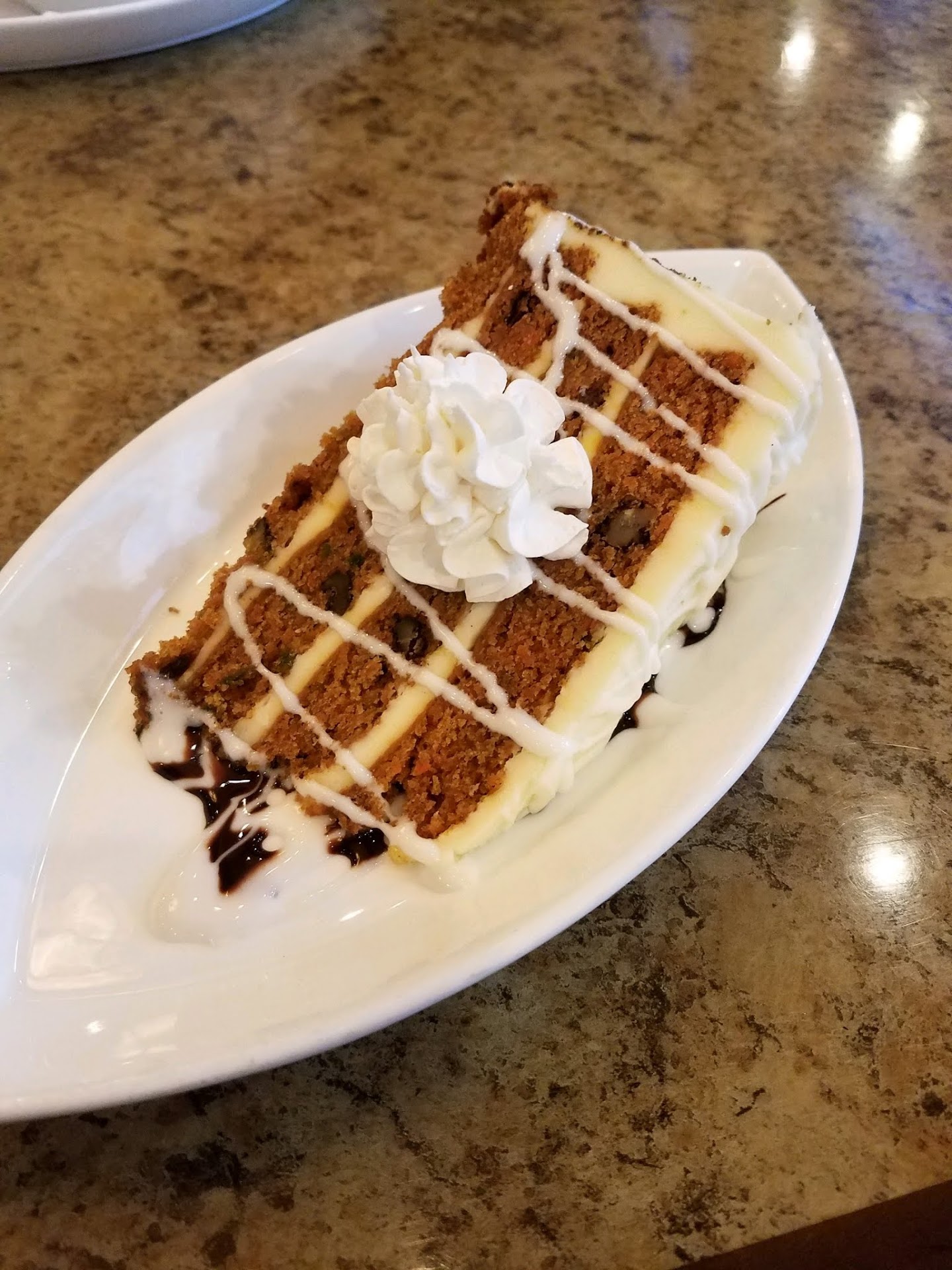 What a GEM! I WISH we had taken pictures of all our food, though one of us remembered at dessert time. Now from the start..... We were hungry and tired of the same old choices locally. Frankly, we had NO idea this place existed! We happened to be driving down Valley, saw the shopping center, and stopped in and found this place. The outside alone is welcoming, beautiful patio, front entry way....you walk in and there's a bar on one side, seating on the other, a very friendly hostess to great you. The restaurant itself is clean, bright but not too bright, the décor clean with a comfortable homey feel. We were greeted then by Hannah. She was warm and friendly, took our drinks, and asked if we wanted bread. We gave her our drink orders, said yes to the bread, and within 5 minutes she returned with both. The bread was warm (2 kinds, white and a wheat, and the butter was soft!!), the drinks were not too strong, not too weak, just perfect in our opinions. We started with mozzarella caprese. Fresh tomatoes, fresh mozzarella, leaves of basil, mixed greens on the side, all drizzled with balsamic. Very fresh, bright, and delicious. At just the right time, dinner arrives. My husband had the Filet Mignon with port wine demi reduction, seasoned vegetables, and garlic mashed potatoes. I had the special that was normally on Monday night but was able to order on Wednesday (cost more, to be expected). Mine consisted of an 8 oz filet, 2 very large steamed shrimp, 1 larger than I expected crab cake, baked potato, and the seasoned veggies. Our steaks were cooked perfectly to our liking, what we requested is what we got. Nothing was overcooked, nothing was undercooked. The seasoning and flavor of everything on our plates was on point. The crab cake was virtually pure crab meat and tasted great. My ONLY suggestion, provide some remoulade to balance out the different flavors and enhance the crab. Onto dessert (how we had room I'll never know!) I asked for recommendations from Hannah, and at her suggestion on what seems to be most popular my husband had the brownie sundae and I had the carrot cake. Neither of these desserts disappointed. The carrot cake (pictured, obviously) was incredibly moist, surprising as many establishments allow cakes to be dry by later it the evening. The amount of icing was a bit more than expected, perfect if you have a sweet tooth, a bit much if you're looking for ratio of cake/icing. However, I still managed to polish off most of it. I need to add that we were never left without being asked if we wanted more to drink (BEFORE emptying our glasses) and we were checked on with regard to temperature and flavor of everything we had through our meal. I credit Hannah with topping off our enjoyable evening, her service was impeccable without being overbearing, nor was she annoyed by any request (a seemingly growing trait among wait staff). Overall we were highly impressed from start to finish. The décor, the staff, the food, the choices, the prices (for the amount you get they ARE very reasonable), all were way more than we expected to find in Winchester. We will 100% be returning to try other options on the menu. We entertain often and will be bringing people with us and look forward to the same dining experience we enjoyed. To close, we have eaten all over the world all sorts of types of food and venues. Not being pretentious, we happen to love food and have spent 30+ years dining in various places to know--in our opinions--what can be considered good and what can't. To find a gem so close to home that was truly an enjoyable meal from walking in the restaurant to walking out...