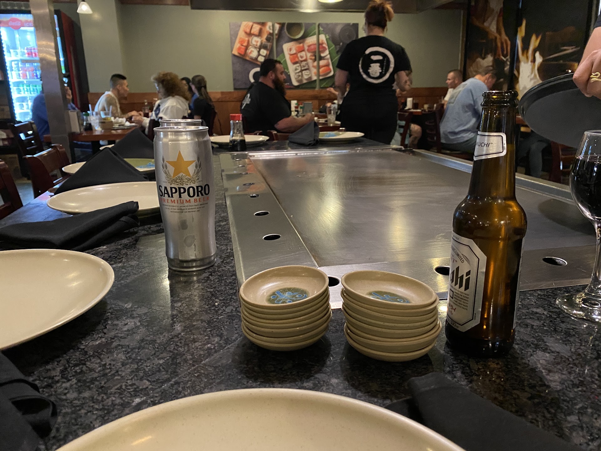 Second thing that struck me as weird was the ambience. The interior is now a few hibachi style grills surrounded by normal restaurant tables. There were even patrons sitting at the hibachi grills not getting hibachi, just ordering off the menu. Also the dining room is also now a carry out delivery room, with a big cooler for drinks, and people walking back and forth with takeout bags that were being prepared and lined up in the same room where you are dining. Felt like being in somebody’s garage that they had converted to a cheap diner..which is also emphasized by the mismatched cheap diner silverware.