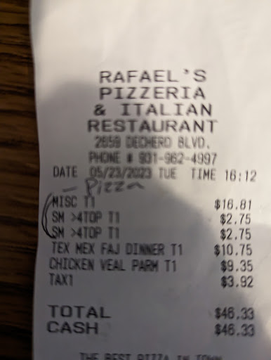 Read moreA friend and I have been eating here for years and the food is very good but when we were there yesterday we had an unwelcome experience. We ordered 2 personal pan pizzas and a small salad and 2 drinks. For the salads we each asked for one of thousand island and one of French and we paid for our lunch. When our order came up we brought it to our table and started to eat our salads. A young man came over and with a woman watching at the counter told us we owed $2 for the extra dressing. My companion said we'd already paid for our food and there had been no mention of an extra $1.00 for each pack of salad dressing. My friend kept saying he should have told us at counter when we paid. It was not the extra $1.00 each of course it was the way it was handled. It made me feel small and as if we'd done something wrong. The older woman kept looking at us. Finally the young man said to forget the extra $1.00. Again we've been enjoying eating at Rafaels for many years and it was not about the $2.00 but it was about the way it made us feel. This is not how you...
