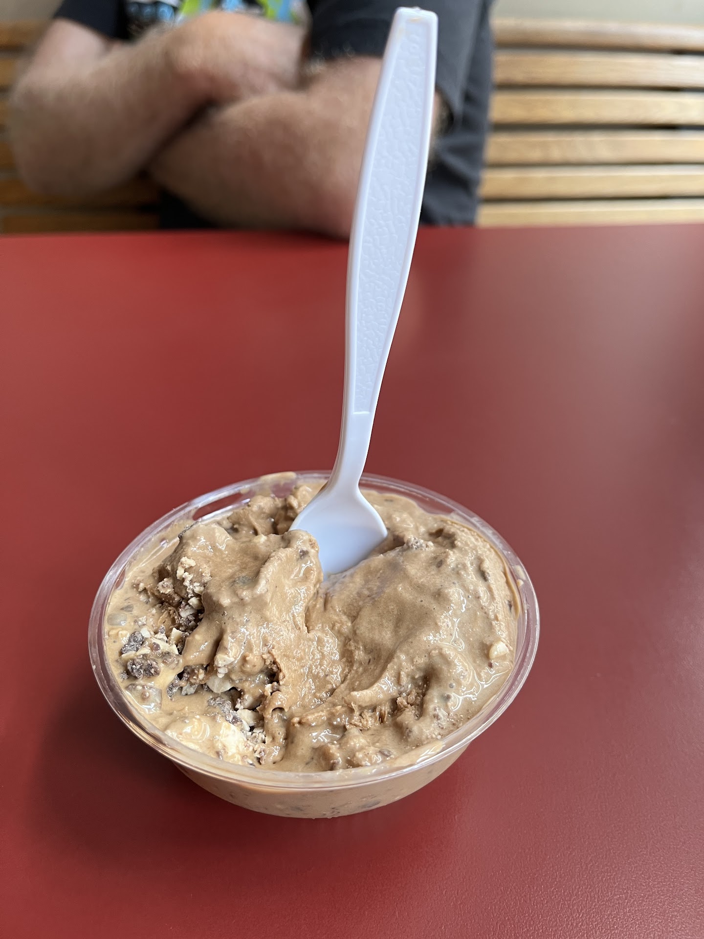 After looking irritated, the woman behind the counter recommended we try the brownie batter. We went for it. After our first taste I knew something was immediately wrong. There were walnuts.