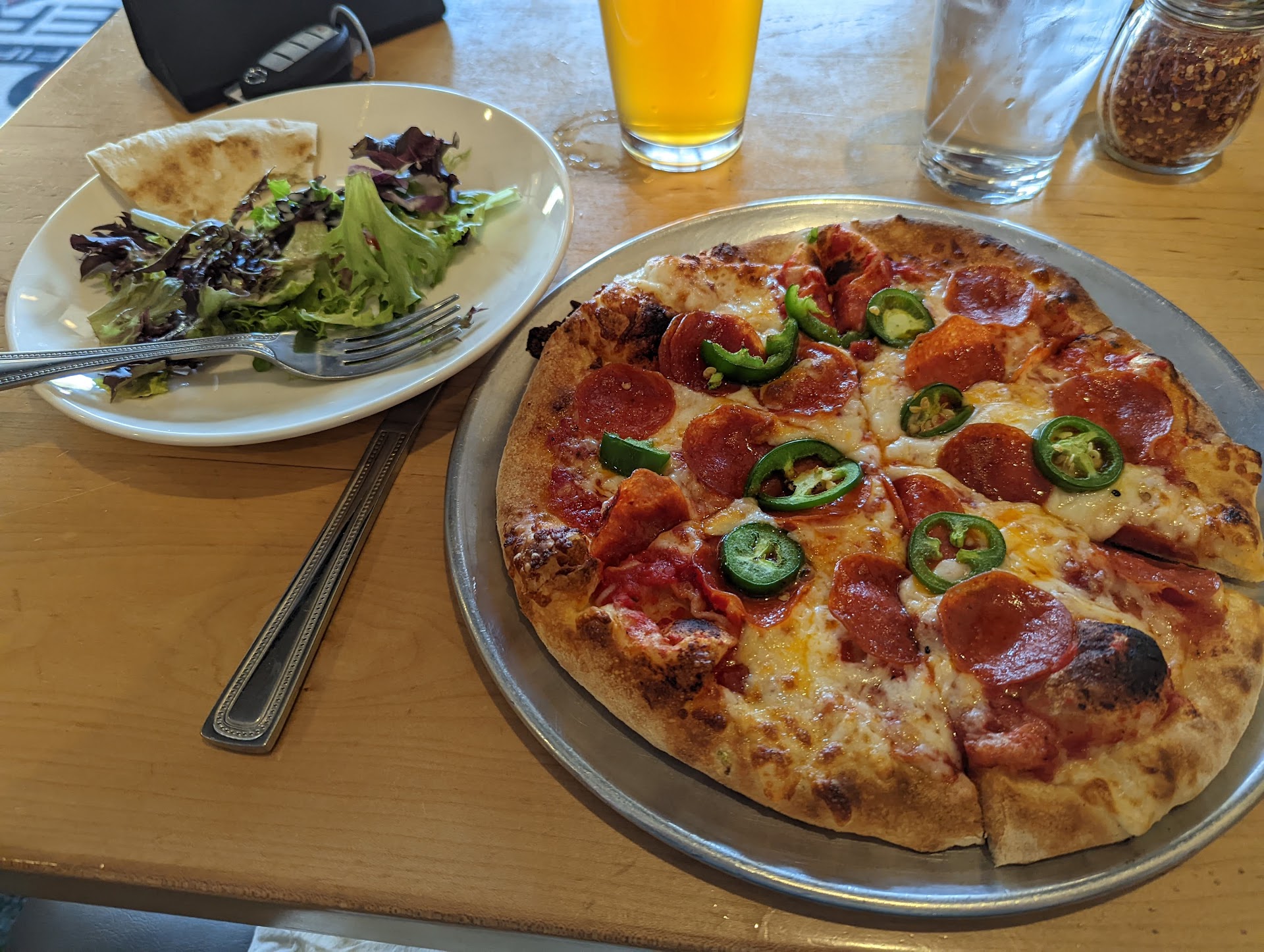 Ā Ā Ā Read moreI walked in at just after noon on a sunday and was greeted by a warm welcoming staff. The bartender, Kelly, was quick to spark up conversation and share the array of house brewed beer on tap. Before really taking a moment to review the menu, I was told the special of the day, a polenta and wild mushroom platter with roasted tomatoes and prosciutto. While I waited I spoke with a younger looking gentleman, Caleb, who shared a some enlightening information about the high level of care and knowledge of the pizza industry and about a pizza makers convention he would be attending in Vegas this month. He happened to be one of the owners and was very approachable and easy to talk to! My entree arrived sooner than I could have expected and keeping in alignment with the theme of pizza, it was presented appearing as such; thick, full, and hearty. The polenta was wonderfully seasonsed and the wild mushroom medley blended well and texture was cleverly balanced by the crispy bits of prosciutto. Roasted, skinned and balsamic vinegar soaked tomatoes pulled it all together with just a touch of sweetness and the zucchini slices broadened the color spectrum making for a very visually appealing dish.
