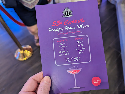 We went here for the 55 cent cocktails to celebrate their 55th anniversary. I expected it to be fancy but it is not. We were the only ones in line to be seated and the hostess was cranky and yelled at us because we were at the podium and not in the que. We stood in the que, alone, for about 5 minutes and we're seated in a 50 percent full restaurant. We waited 10 minutes for any service at all. The waitress was very attentive and kind, however. And the busser/drink deliverer (Elmer?) was very friendly and even joking with us. Elmer gets 10 stars for being one of the nicest parts of our meal. I ordered the Nashville Hot Chicken with fries for $20 and my husband ordered the Chef Special of salad, prime rib, potato, veggies, and cheesecake for $42. The salad came with the choice of ranch or blue cheese. No other dressings. Then the waitress mentioned he could have a Caesar salad so he chose that. The salad was pitiful. A couple cherry tomatoes, a tiny cucumber slice, and wilted lettuce, with a cup of Caesar dressing on the side for some reason. Not good. We were not looking forward the entrees. To our surprise and delight, the entrees came out timely and were fantastic! My husband said it was one of the best prime ribs he has had. My Nashville Hot Chicken was very spicy but the addition of the perfectly creamy slaw made for a very satisfying bite! I usually don't care for restaurant fries but these were cooked to perfection and seasoned great! Then the cheesecake arrived. Oh my! Very good cheesy/creamy texture and taste with fresh berries on top! Yum! For the 55 cent drinks, you get about 1/4 shot of well liquor with choice of juice or cola. I guess 55 cents is about the value so I can't complain but don't come here for the drinks. In summary, it looks like food AND service is hot or miss. Prices aren't too outrageous but don't expect anything fancy. It has a casual diner/cafeteria feel, not cozy or romantic at all. The vibe is just...