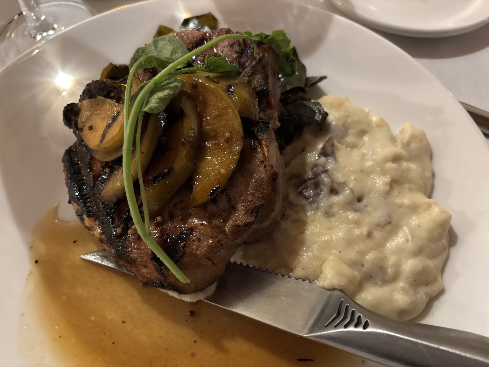 For my main course, I went with the grilled bone-in pork porterhouse, served with caramelized apples and tender collard greens. It was incredible. The flavors were perfectly balanced, and the pork was cooked to perfection—juicy, tender, and full of flavor.