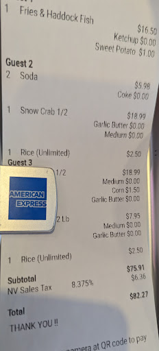 Read moreMy husband loves king crab! Since Joe's Crab Shack closed, we hadn't tried another crab place since we moved to Las Vegas 7 or 8 years ago. The other day was my husband's birthday. I figured crab legs would be a good surprise for his birthday dinner. His stomach doesn't do well with spicy food. There's a crab place that recently opened that my neighbor & I had been talking about. It's called Yummy Crab. Their online menu has a no spice option, which is what sold me on trying this place. It also implies that 1lb of king crab is enough for 1 person for a meal.(sounded reasonable since the king crab legs I've seen at grocery stores & crab legs we used to get from Joe's were big long crab legs & about 2 or 3 big long crab legs were sold as a lb.) It said the crab legs comes with corn & a potatoe, if you order & let them boil more than 1lb in the same bag. I ordered 2lbs of crab with "no spices". The bag was in a outer opaque bag that was tied shut when I picked it up. When I got home I set the table & opened the opaque bag. Inside there was a clear bag filled with a spicy liquidy oily substance with a few very small king crab legs submerged in it. I was still optimistic & opened the inner bag. My husband fished a couple of miniature king crab legs out of the spicy goo & so did I. It was hard to even hold on to the crab legs. They were so slippery & slimy from the spicy, oily, liquidy goo that filled the bag. The liquidy goo was not hot cajun spicy, but it was still spicy. (Would have probably tasted good if I hadn't been expecting it to have no spice like I had ordered. ) After eating the first crab leg, my husband said it would be better for his stomach if we rinse the spicy slime off the rest of the legs. While rinsing the crab legs we found 1 really small bite sized potatoe & 1 corn cob about 1½inch long. (If things weren't bad enough, the liquidy goo clogged the sink) Since it was supposed to be my husband's birthday dinner, I let him eat the other 2 or 3 small crab legs & fixed something else for me for my dinner (there clearly wasn't enough crab legs for 2 people & it didn't come with anything else.) I ended up getting a shake, less than a hour later, for my husband since he was still hungry. For $140 I expected to have dinner for 2, prepared the way I ordered it! I would not recommend this place to anyone! After hearing of our experience at Yummy Crab, my neighbor says there's no way she wants to try going there. She says that she's going to call other friends that she had told about it opening & let them know that it's not worth going there. I doubt Yummy Crab will stay open long. It will be hard to get repeat business if everyone that tries it has as bad of experience as we had. The people there were friendly as I picked up the order. That's about the only positive thing I can say about our 1 experience getting food from there. I was extremely...