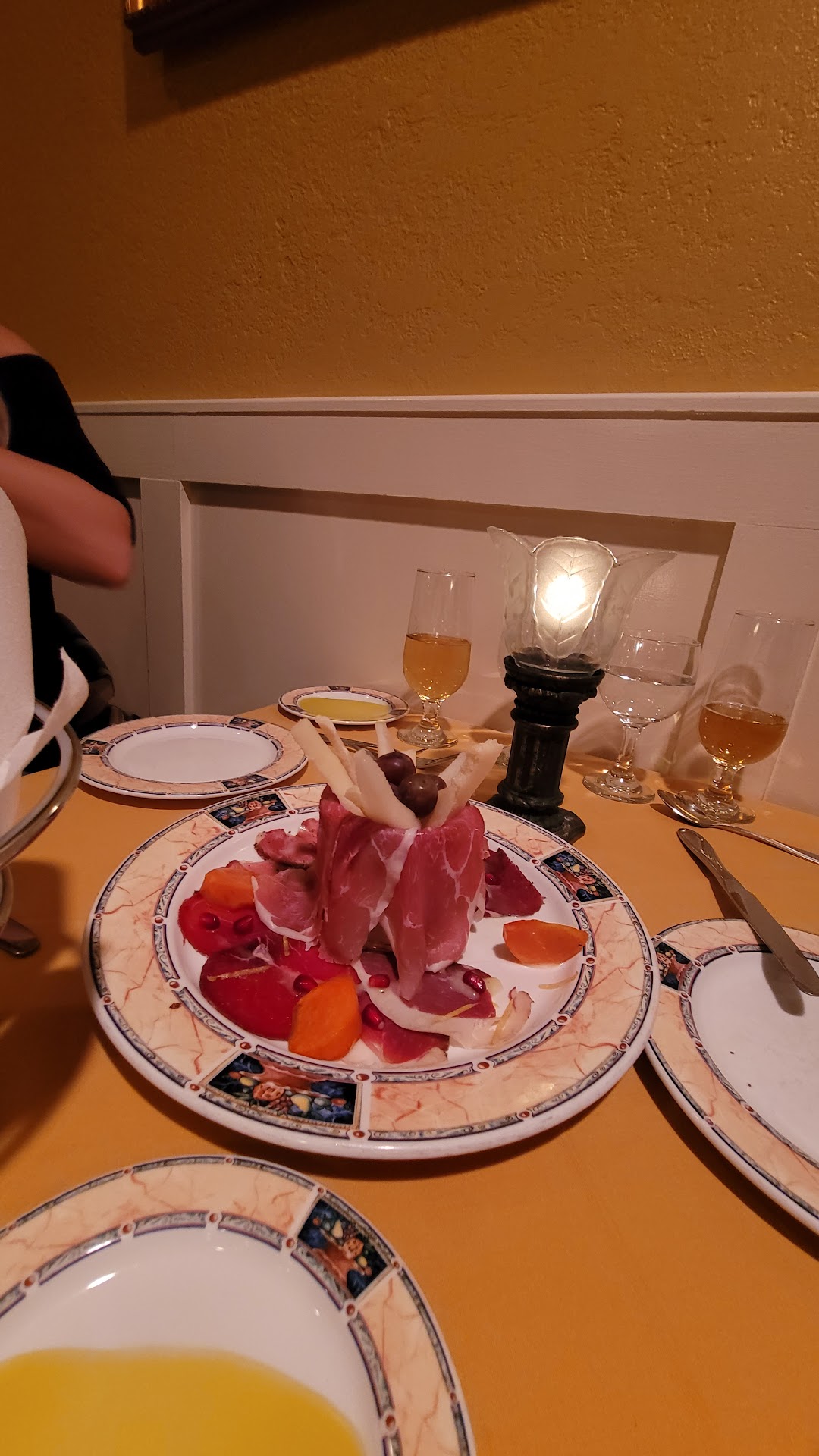 Appetizer: The meat curtains. Horrible presentation. It looks like my 7 year old plated the dish. The prosciutto was chewy and the other meat (boar, venison, beef) had a lemon zest drizzle on top that is not appropriate on the meat served... The meat curtains draping from a cheap glass bowl is just wrong.
