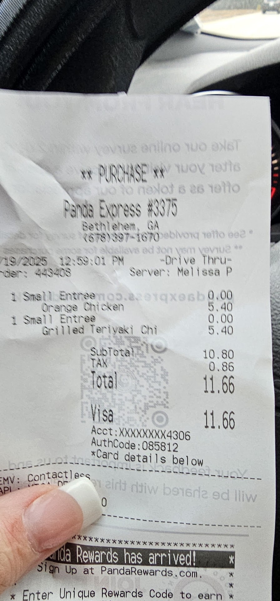 Read moreI typically frequent the Panda Express restaurant in Loganville, Georgia, located at 205 Athens Hwy, Loganville, GA 30052, as I spend a significant portion of my week in that vicinity. The food there consistently tastes fresh, meets my expectations, and is reasonably priced. However, since I reside in Bethlehem, my family and I were craving Panda Express. Consequently, we opted to visit this particular establishment due to its proximity and the fact that it was already 6:00 p.m., which is relatively late. I am uncertain whether our experience was negatively impacted by our arrival near the end of the restaurant’s service hour, since we usually have Panda for lunch. It was evident that the establishment was quite busy, and I cannot rule out the possibility that the servers were experiencing burnout due to the rush. Nevertheless, once we received our order, the chicken teriyaki we ordered, we noticed it felt hard and chewy when we bit into it. Consequently, we brought it to the attention of an employee, who informed us that they would provide us with the most recent chicken that had been prepared. As I turned away from the recent conversation and looked back, I noticed that the employee had mentioned our request to whom I presume was the cook that prepared the chicken. His body and facial response appeared dismissive and seemed to shrug off the comment. I perceived that they believed our intentions were to obtain free food or something similar, which I have never felt compelled to resort to such measures, as I have always been able to afford my food. Anyways, Upon trying the “newest” chicken provided, we discovered that it tasted indistinguishable, almost as if they gave us the same chicken just reheated. Considering the price we paid, we were not satisfied with the quality of the food and experience. Wouldn’t...