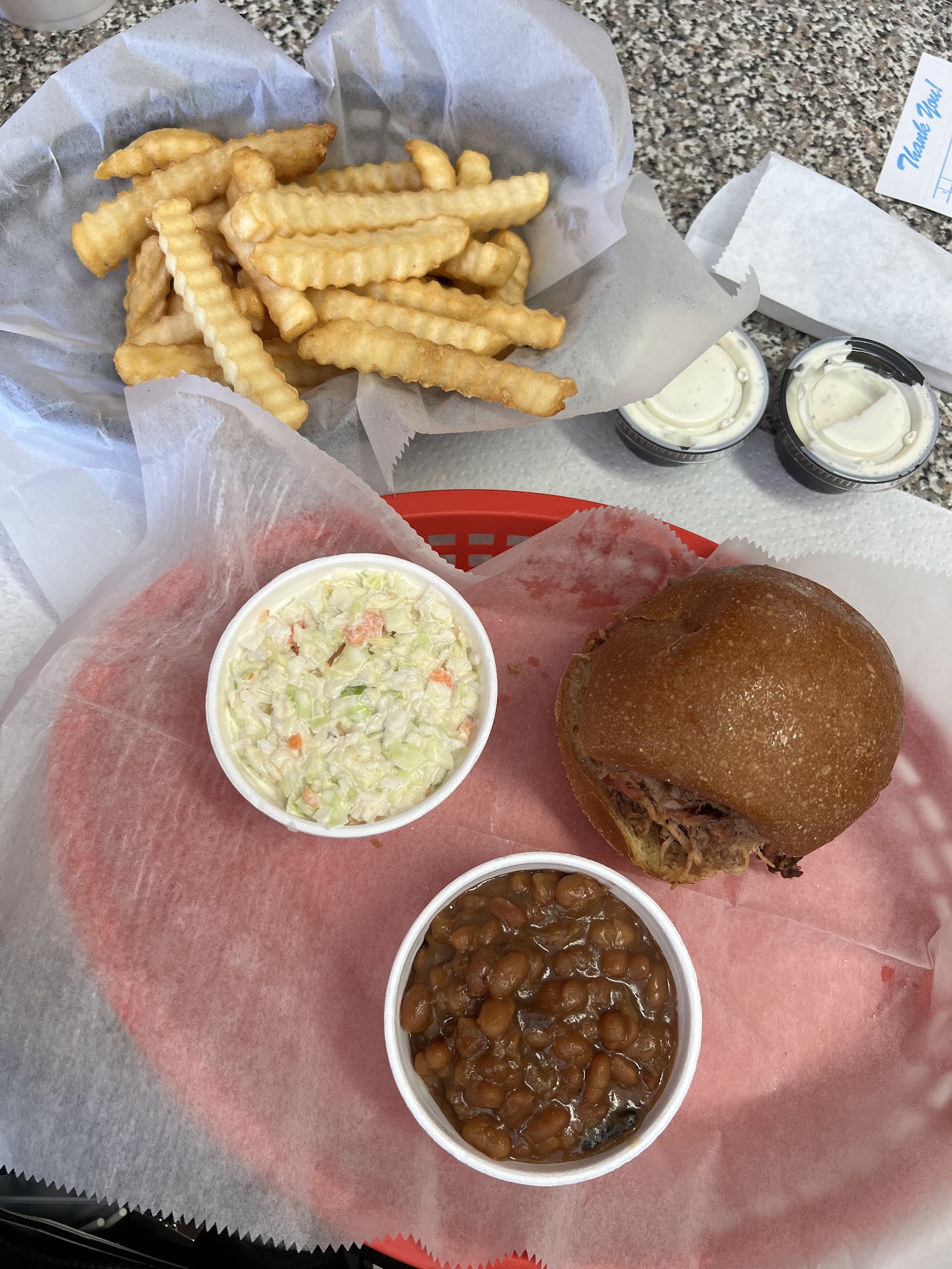 I ordered a half rack of ribs with potato salad and coleslaw and, of course, an order of banana pudding as a to go order.