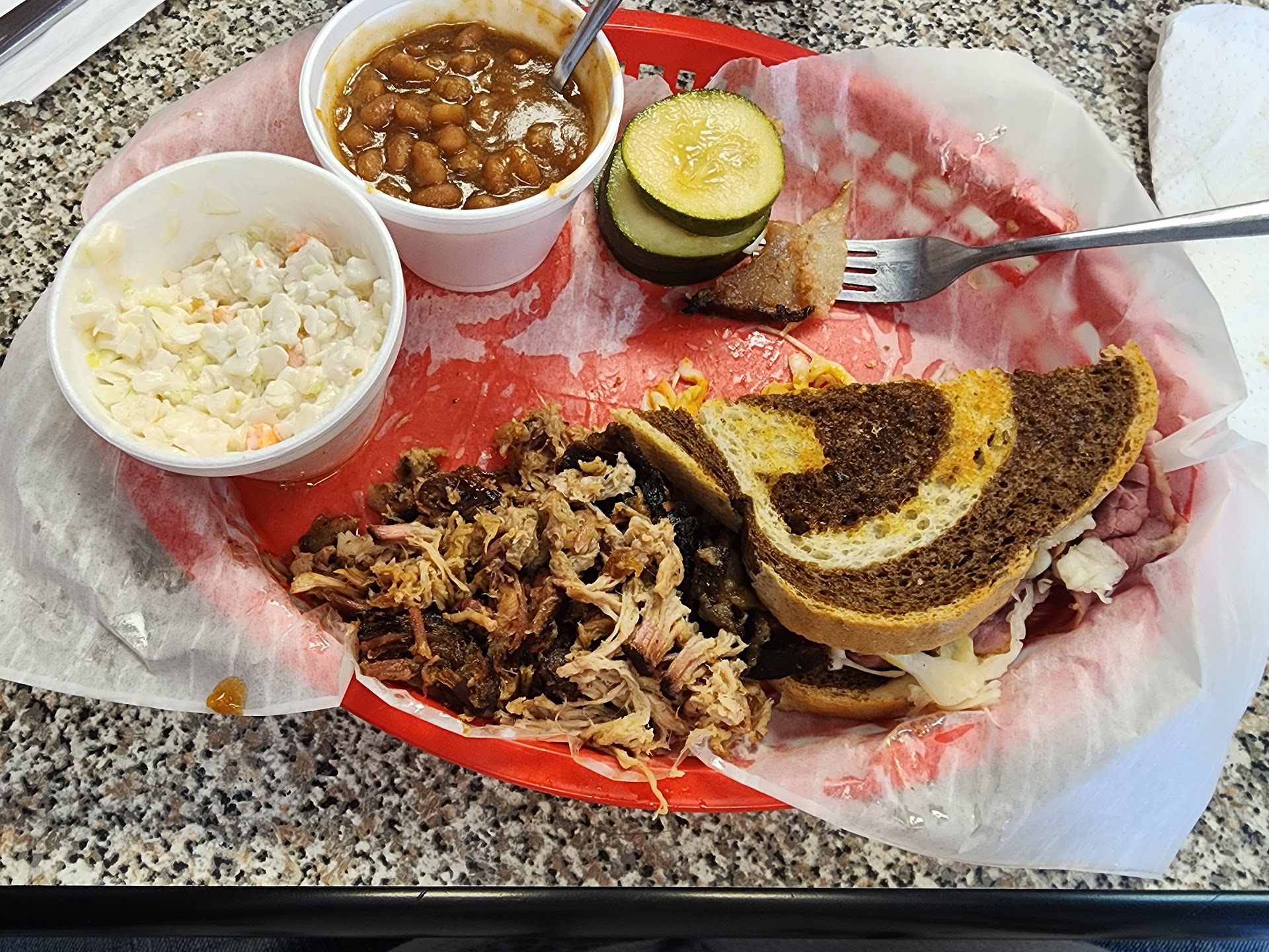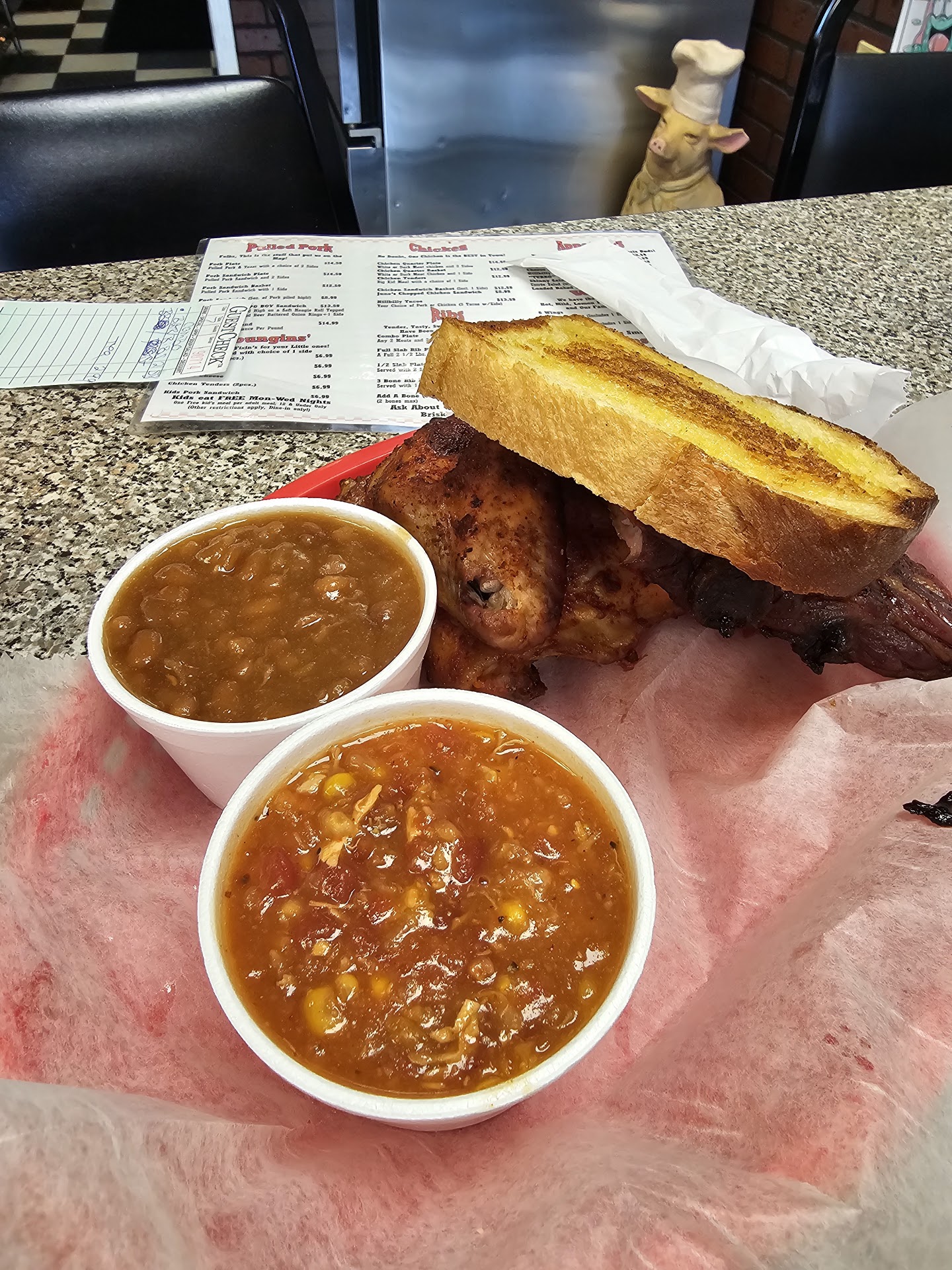 Came by on Sunday about 6:30pm. Seemed to be plenty of polite staff. We ordered the pulled pork with Brunswick stew and crinkle cut fries on one plate. Big slice of grilled, I am sure, homemade garlic bread, complimentary with each plate. We also ordered a combo plate (2 meats with 2 sides. I had ribs and chicken with stew and potatoe salad both made fresh in the kitchen. We chose sweet and vinegar based sauces as accompaniments and they were excellent. The meats were cooked to perfection. I could almost simply shake it from the bones. The pulled pork was nice and moist.The sides also were wonderful. The stew was thick and not runny as some are. French fries were crinkle cut but cooked perfectly. The potatoe salad I especially liked, it was mayo based and creamy. All in all, the meal was absolutely up to my expectations and we will return to try the offerings of the chef as it is advertised that he was a graduate of the culinary school in Birmingham, AL. When we do go back, I will take my wife's recipe for Southern banana pudding for him to peruse because the 2 portions that we paid about $7.00 for went in the trash after 1 spoonful. We were extremely disappointed. There was no meringue. It was probably Cool-whip or something similar. The pudding was a good consistency but the texture was not smooth, it had tiny particles in it and I suspect it may even have come from a jar due to the metallic-like flavor that stayed on the tongue. It seemed to have bananas but I didn't see any Vanilla wafers because as I said, one spoon and we were both done. A real disappointment after such a fine meal. Never the less, WE...