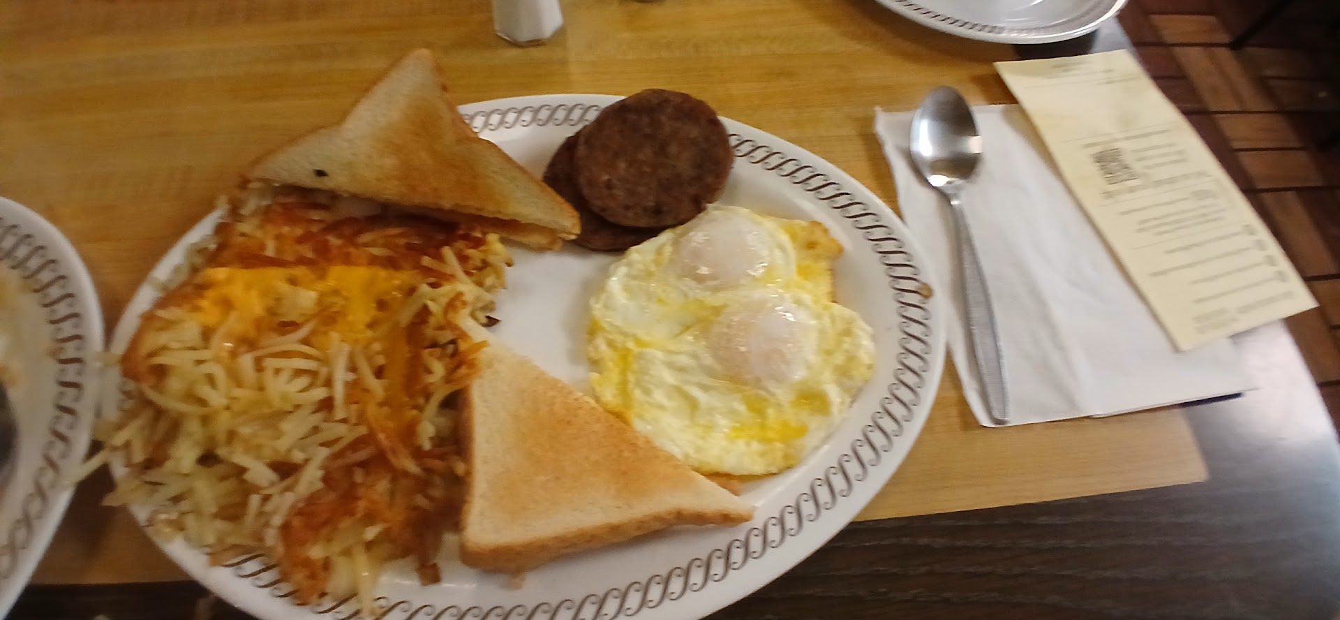 Ā Ā Ā Read moreMy hubby ordered plain hash browns, a sweet tea, and a Deluxe Double Cheese Burger, it didn't have cheese on it when it came to the table so we had to ask for it. I ordered a waffle with two scrambled eggs and a coffee. Waffle came to the table cold because they set it aside on the counter while my hubby's food and my eggs were cooking. So we had to ask them for another waffle to be made. While waiting for my waffle, I noticed that there was a build up of waffle batter around and under the waffle iron.. Had to also ask for coffee and iced tea to be refilled (which the waitress did not bother to put any additional ice in my hubby's cup) and to ask waitress to explain a 45 cent charge which was for lettuce and tomato on his burger(there was nothing stating that there would be an extra charge for the lettuce and tomato). Aside from that, 2 of the employees were being very loud almost to the point of yelling with their conversation. I can understand yelling out food orders, but food wasn't the topic of conversation... We are extremely disappointed with the food, the service, the way the food cook space is kept and have made the decision to no longer eat at Waffle House ever again... I work in a restaurant myself so there are somethings that I can understand, but this was just beyond...
