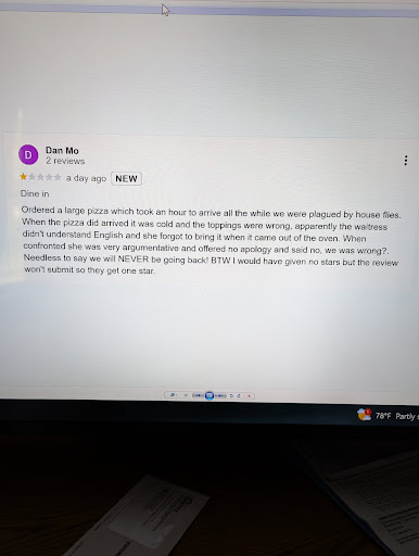 Read moreOrdered a large pizza which took an hour to arrive all the while we were plagued by house flies. When the pizza did arrived it was cold and the toppings were wrong, apparently the waitress didn't understand English and she forgot to bring it when it came out of the oven. When confronted she was very argumentative and offered no apology and said no, we was wrong?. Needless to say we will NEVER be going back! BTW I would have given no stars but the review won't submit so they get one star.