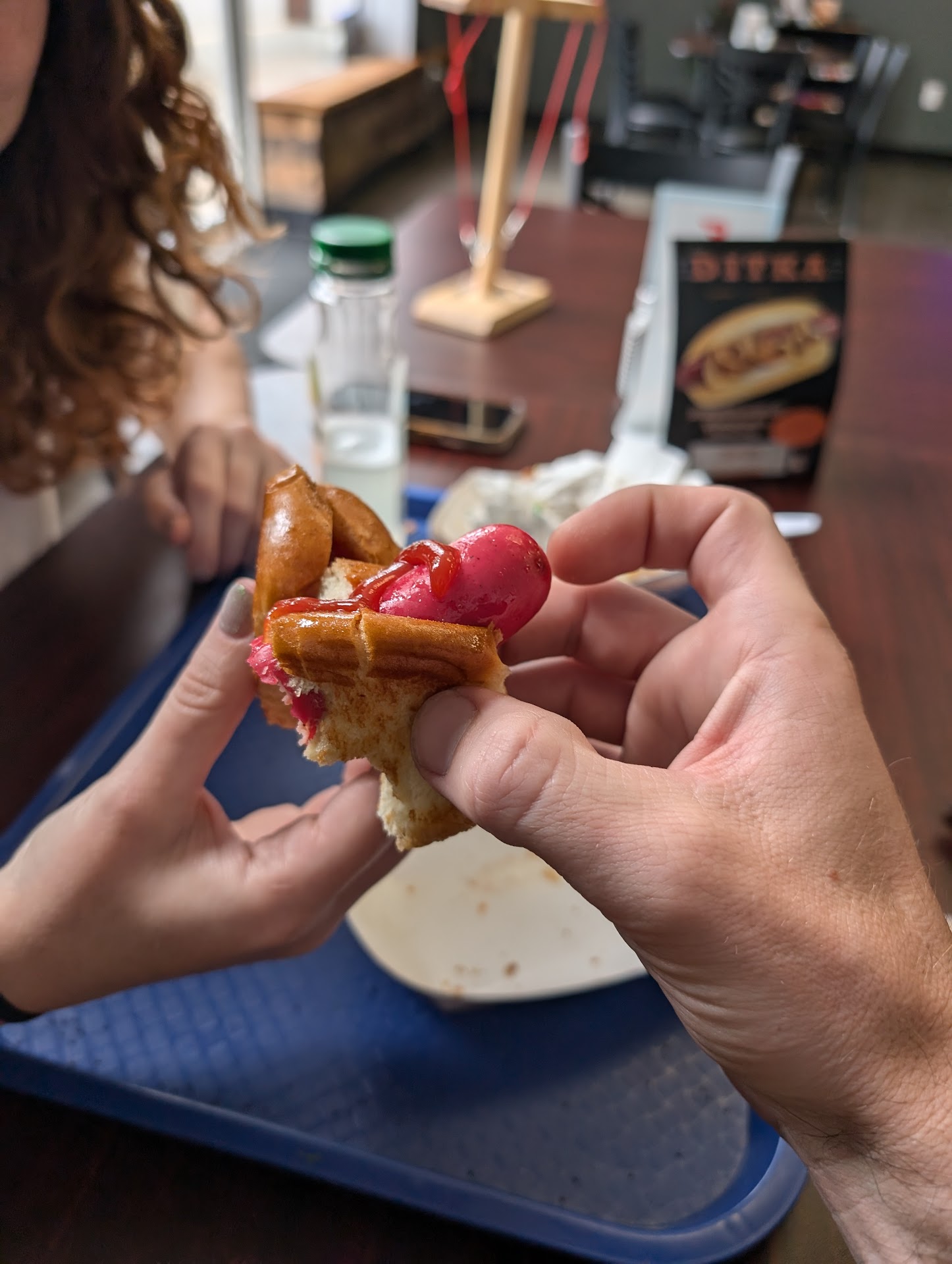 We went in on Sunday August 11. First time in, I bought the Chicago dog. It was good I ate the pickle separate as all the filling was enough to handle. My partner ordered the double burger. (Looks like a big mac) I tried a taste and it was by far MUCH better. The hamburger was juicy and the toppings were great. The fresh cut fries were delicious. I love the topping choices they have available. White vinegar was my choice. The owner came over introduced himself and was very pleasant! We sat indoors and it was clean, cool & very comfortable. The food came fast and was enjoyed. Another family came in with 2 little girls. The owner has a book shelf with toys to amuse them. They were happy! Nice to see a good burger/hot dog shop open in Windham. They are next door to the Windham Post Office in the strip mall. We'll definitely be back lots of choices and they sound amazing! Thank you Cormier Dog House for a family run reasonably priced option in town.. I didnt take a picture but, I assure you...