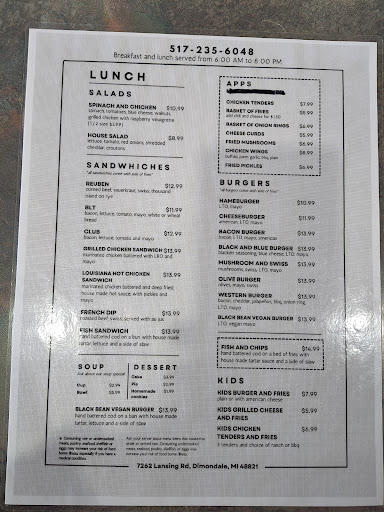 Read moreVisited twice now! Once to dine-in with my husband and 3 year old. Then separately for pickup. Both times we had breakfast and each time the food was wonderful! We've tried the breakfast burritos, sandwich, biscuits and gravy, meat lovers and southern omelets. Everything was hot, and food sizes were large and staff was friendly! My only gripe is inconsistency in hours (maybe that's fixed now?) Either way I can't wait to try lunch some time. Thanks for providing the people of Dimondale with a great...