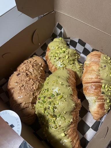 We're not coffee drinkers, so I can't speak to their brews, but their matcha lattes are GREAT, especially the specialty flavors! Hands-down the best thing they sell are their pastries, which appear to be made fresh in house. The selection varies daily, and it's exciting to get to try new things-- even if it isn't to my taste, I have yet to have a bad pastry here. Our favorites are the red velvet croissant, the vol au vent pastry, the ham and cheese croissants, and the large stuffed donuts. Their boba lemonade is also pretty good! We love grabbing their pizza slices, which they have most days. They're delicious, bready, and really filling for around $6 dollars.