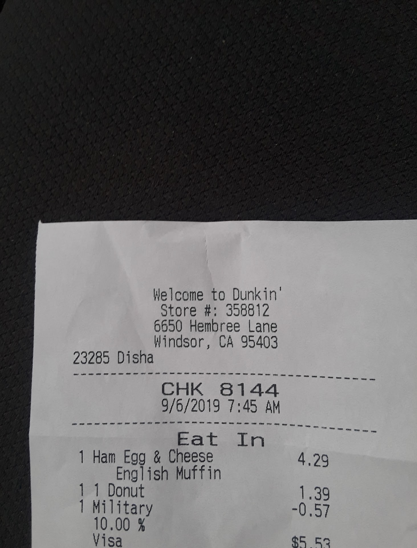 I give this Dunkin location a 5 Star rating. Thank you for taking care of Military and former Military and friendly...