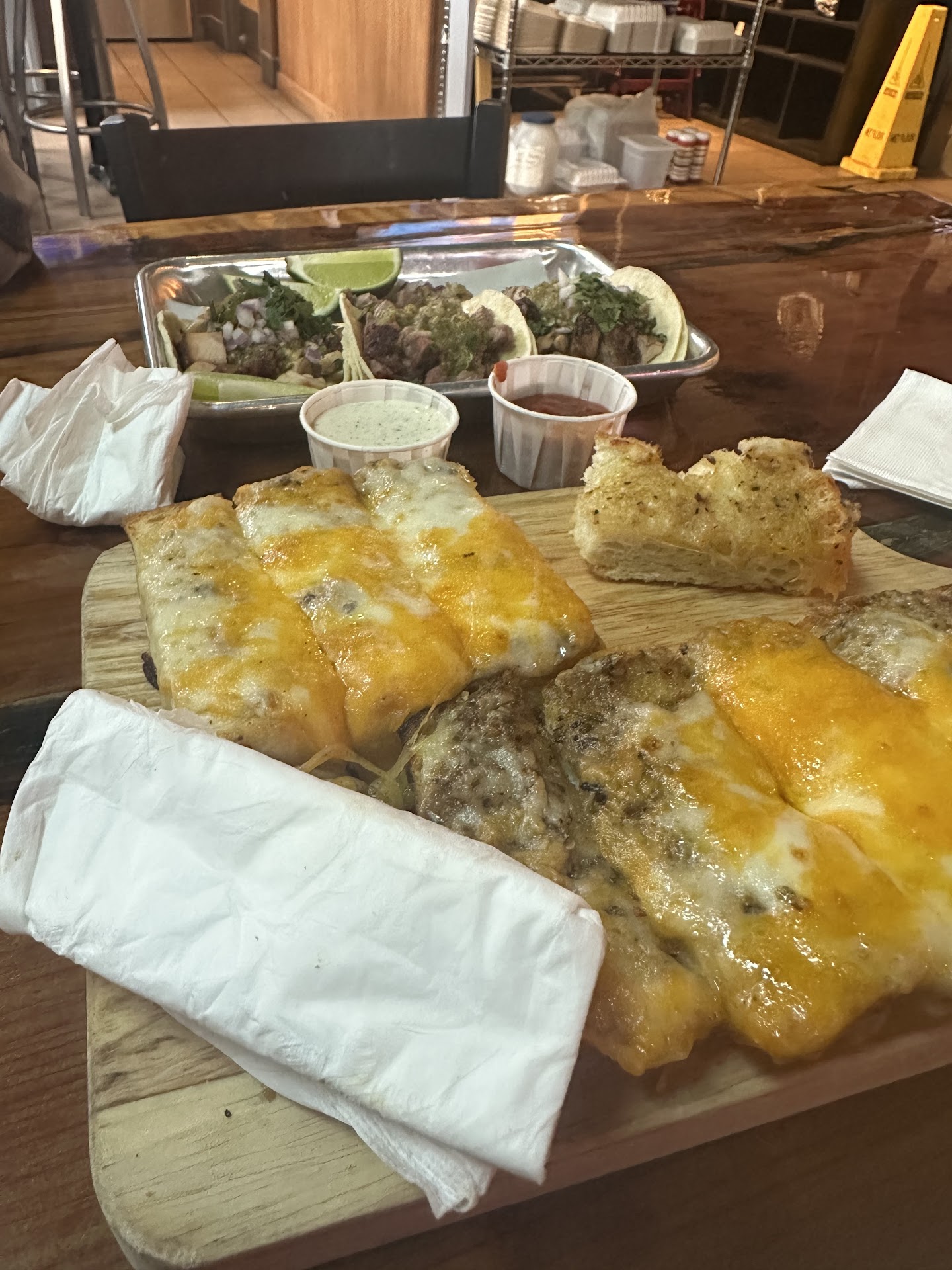 Man what a place to give a try and such a let down probably won’t be back here again…..was super hungry with my girlfriend so got a beer ordered some food even though draft list is mediocre…Thought this menu is a little crazy so let’s just keep it simple she got 3 tacos I got the garlic bread and let’s just say that’s all it took to stay away from this place. Bartender couldn’t even do a simple no onion task on tacos and the meats all tasted the same even though she had 3 different choices, on top of that the garlic spread or whatever was used was super dark and tasted old. Bartender/Chef didn’t even offer refund after he noticed we were unsatisfied with the food he brought out instead tried to offer us to look over the menu again and pick something else to waste our money on. On top of that there were probably 2 or 3 employees in there on there laptops I’m assuming part of the team planning on how to make this place not lose anymore money I hope. If you made it this far on this review the fries are great over at the Publican and I’d choose KCs kitchen over this place...
