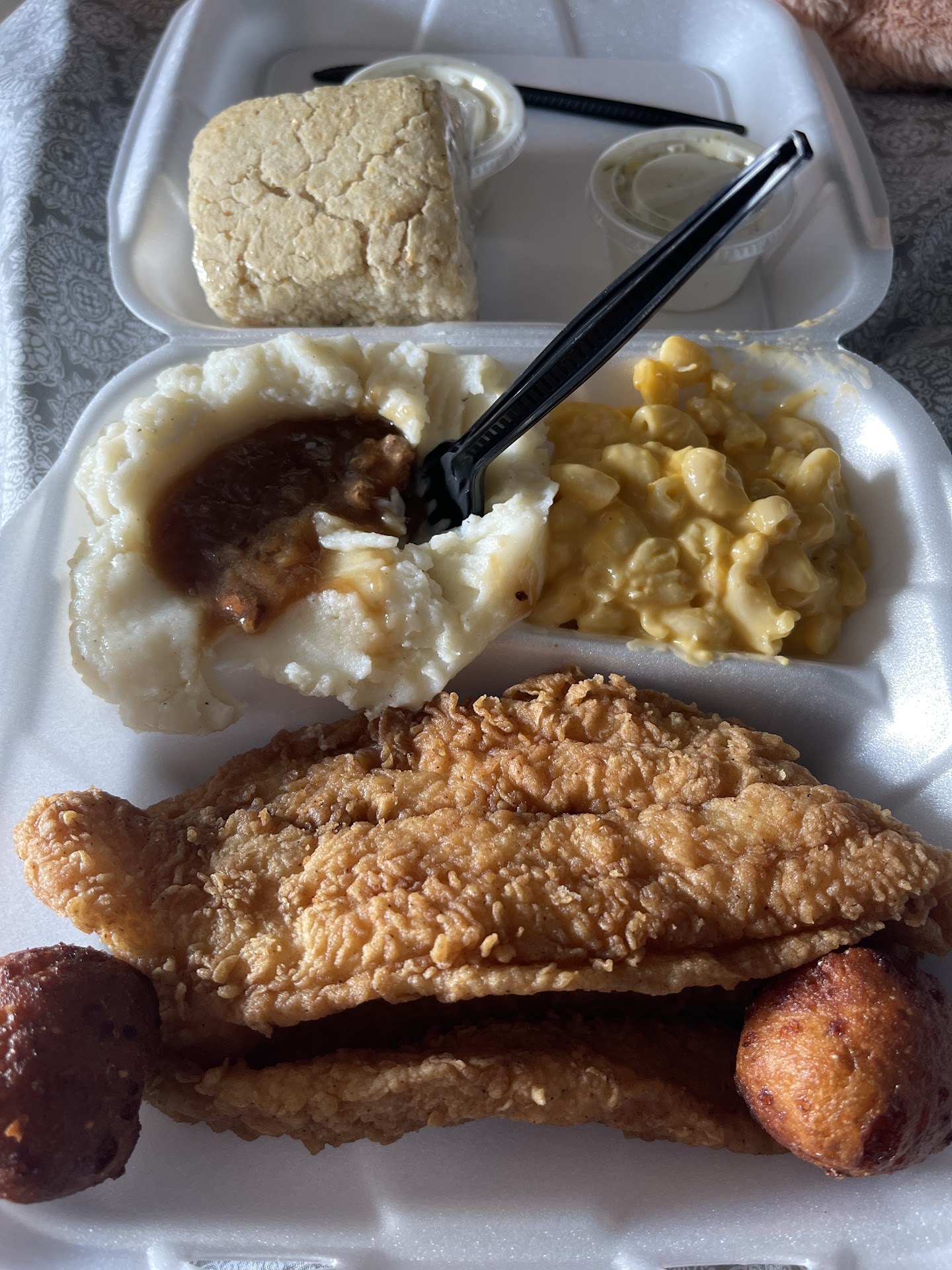 Read moreLet me be honest with you for a moment. The food looked good. It's good southern comfort food. They give plates that come equipped with a main dish, 2 sides, 1 bread, a drink, & a dessert. A great deal for a reasonable price just under $10. Unless you add on of course. My meal totaled $18.00. That was because I added on 3 tenders to my goulash plate & ordered a full plate of goulash & not a half order. The food is unseasoned. As I sat there eating my food suddenly I started hearing all this coughing. With these airborne diseases going around & the like it made me regret eating inside. However, it wasn't just the customers doing the coughing as I heard it coming from the food server as well. Half my plate was gone when she started. The food is filling, but the flavor just isn't matching what you...