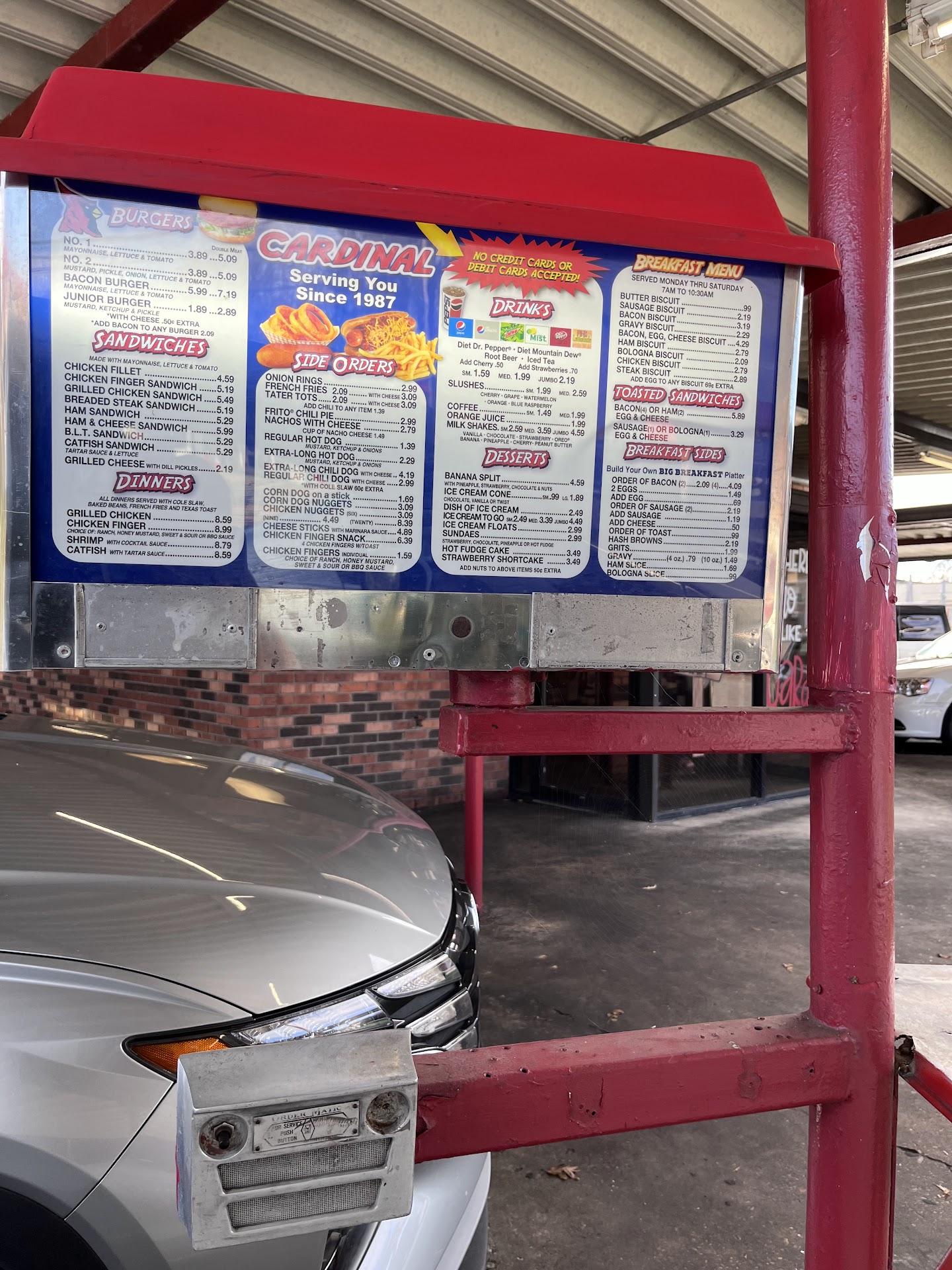 Cash or check ONLY - always worth the stop! The sign says "since 1987" and I'm almost certain everything at this adorable drive-in is still original--and I mean that in the best way! We've eaten here twice, when in Winfield for sporting events, and it is the highlight of our trip. Every single thing on the menu is delicious and you can it's made fresh to order with quality ingredients. I never thought I'd feel so passionate about a "fast food" joint, but trust me when I say it's worth a stop. We've tried the burgers, corn dogs, fries and onion rings. My picky 8 yo rated the onion rings 10/10 and I have to agree. The star on the menu for me has got to be the strawberry shortcake! Service is fast and friendly. The Cardinal Drive Inn has got a good thing going and I hope the continue for many...